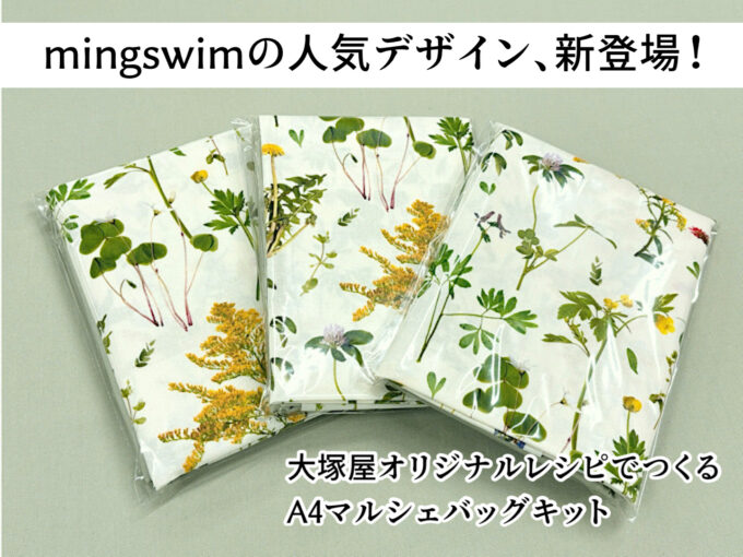 プリント生地 mingswim(ミンスイ)の人気柄をキットに!「大塚屋オリジナルレシピでつくるA4マルシェバッグキット」