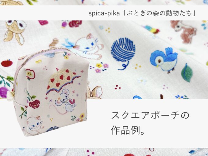 プリント生地 動物刺繍作家 spica-pika(スピカピカ)さんの布「おとぎの森の動物たち」でつくるスクエアポーチ