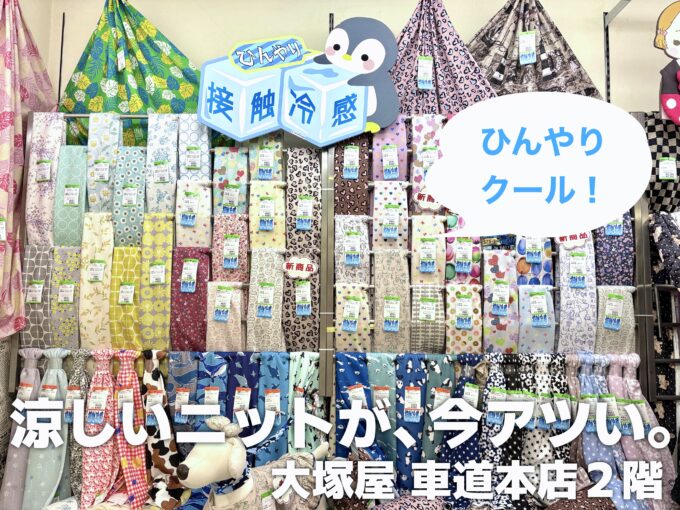 ぬのにちは♪大塚屋でございます。大塚屋ネットショップで今、ホットな盛り上がりをみせている生地といえば、涼しいニット生地「クールクロスニット」です。その盛り上がりは、通販だけではございません。例えば名古屋の大塚屋車道本店2階でも模様替えを行い、接触冷感ニット生地を集めたコーナーを展開しています。店舗中央のエスカレーターを上がって2階へと進むと、接触冷感ニットコーナーが見えてきます。壁面に飾られた、さまざまなデザインのクールクロスニット!(店舗では「スポーツニットプリント」という名前で販売しています)このように、涼しいお洋服づくりに大活躍。さらに、コーナー中央から顔をのぞかせているのは・・・ニット