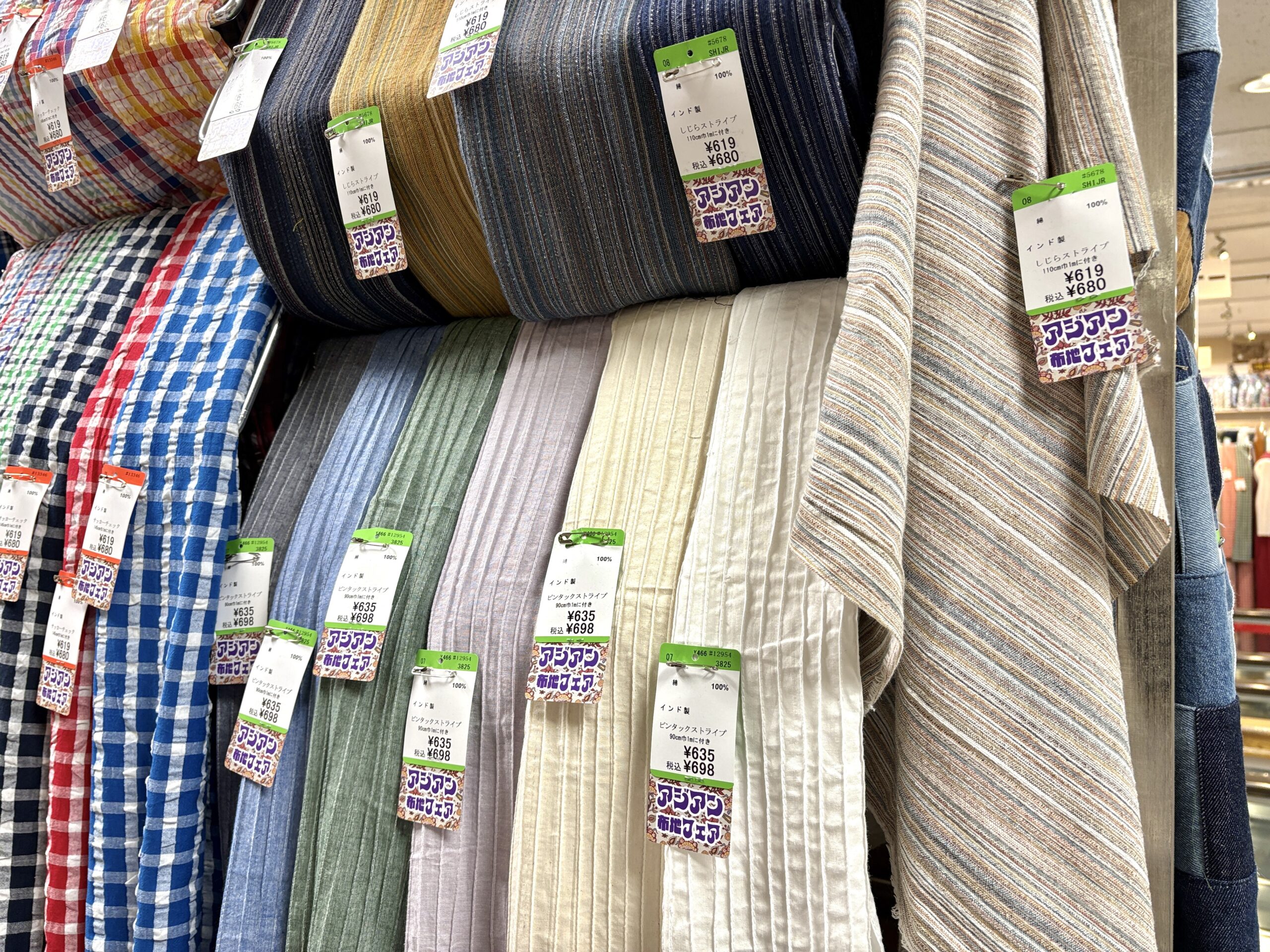 ぬのにちは♪大塚屋でございます。国内のみならず、世界中からさまざまな布地の集まる大塚屋。それは、タイやインドの布地も例外ではございません。\ 現地で撮影した写真です / この度「大塚屋仕入れチーム」で実際にタイやインドの現地に赴き、大塚屋の店頭に布地をたっぷり買い付けいたしました。それを記念いたしまして、「アジアン布地フェア」の開催が決定いたしました。例えばこちらは、名古屋の大塚屋車道本店の3階です。 ここ最近で、驚くほどたくさんのアイテムが店頭に登場いたしました。2025年4月13日の朝に車道本店で撮影したばかりの、商品ラインナップをご覧ください。 また、大塚屋車道本店1階にも、同様にタイ・