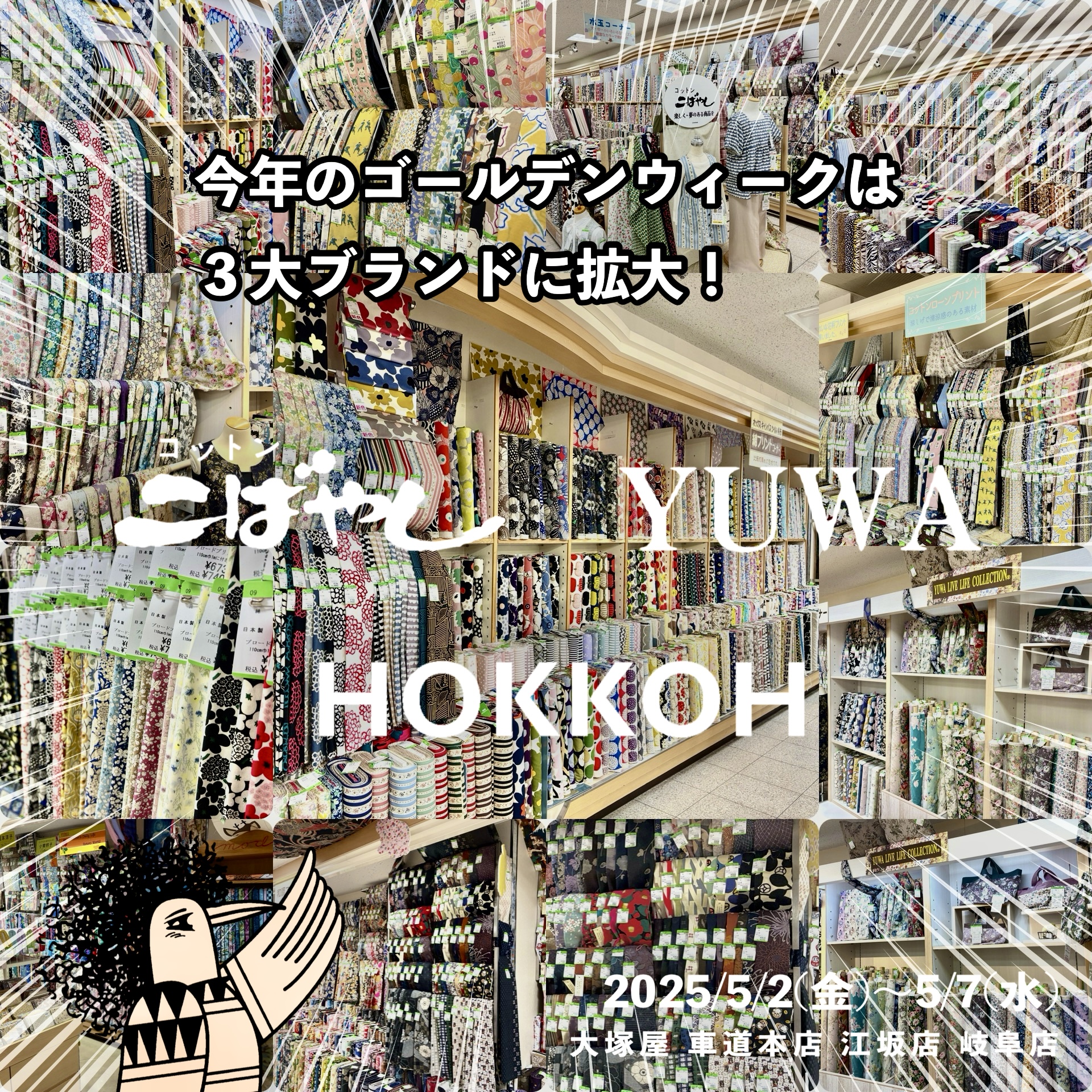 昨年の2大生地ブランド「コットンこばやし」さんと「YUWA」さんに加えて、今年は新たに「HOKKOH」さんのプリント生地も加わり、全3大ブランドに。