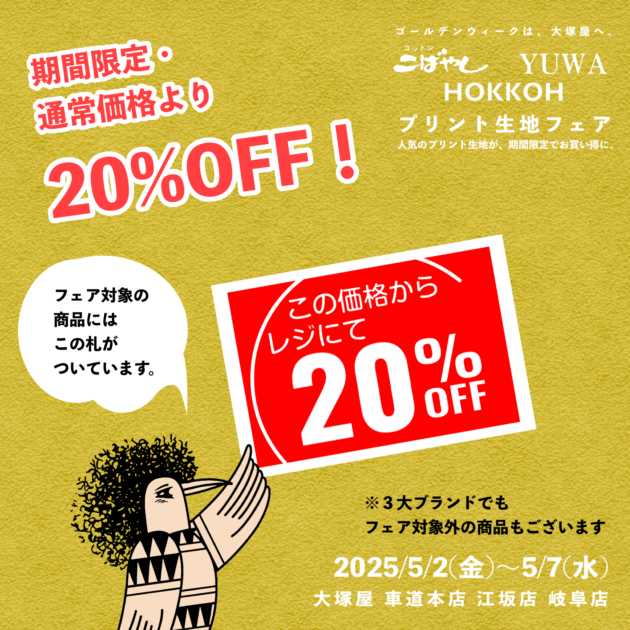 このように昨年のゴールデンウィークに開催した人気企画「プリント生地フェア」が、今年はさらにパワーアップいたします。