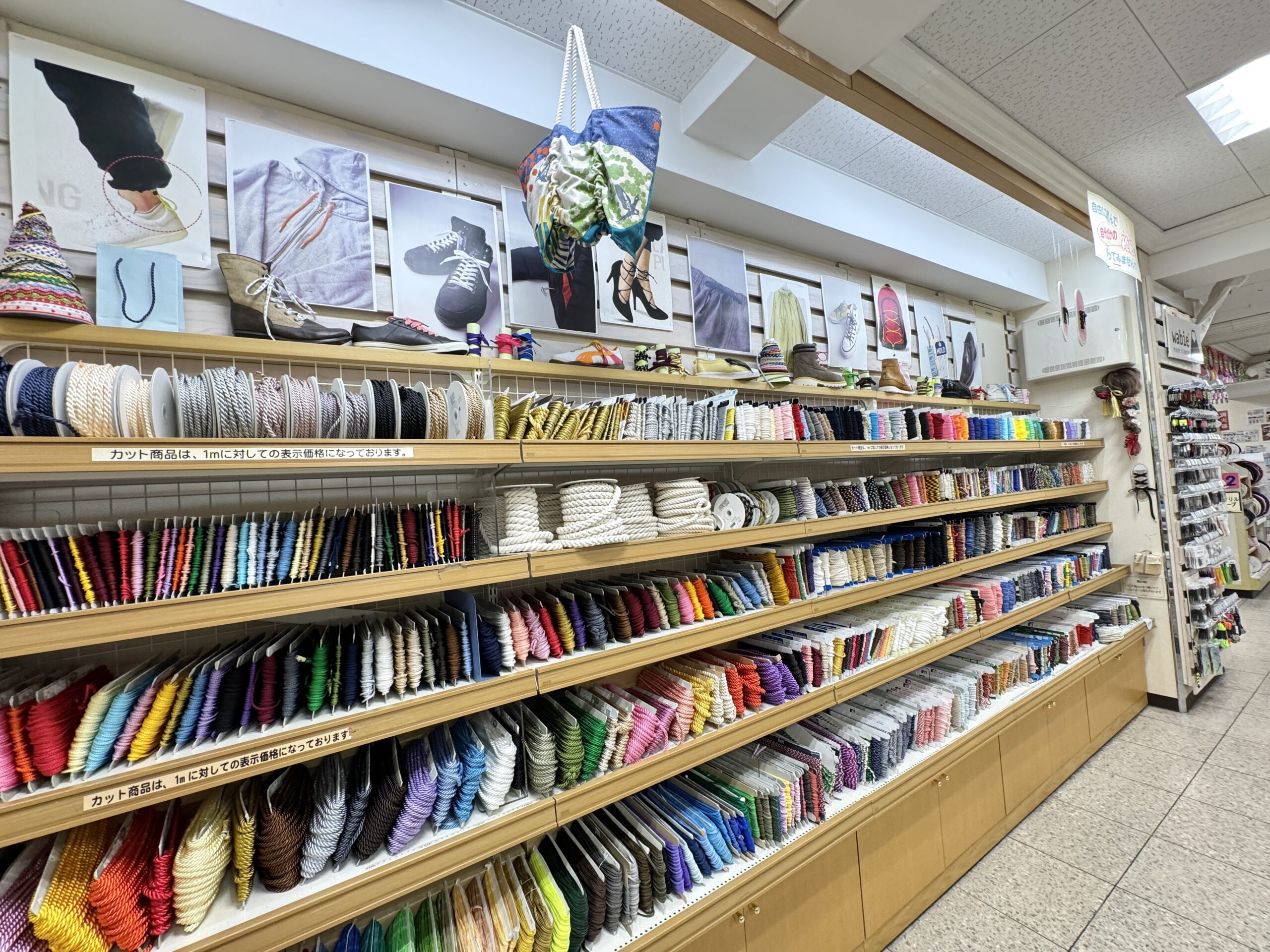 こちらは「ひも」のコーナーです。ソーイングを楽しまれる方以外にも、例えば「スニーカーの靴紐をアレンジしたい」といったニーズにもお応えできるラインナップです。
