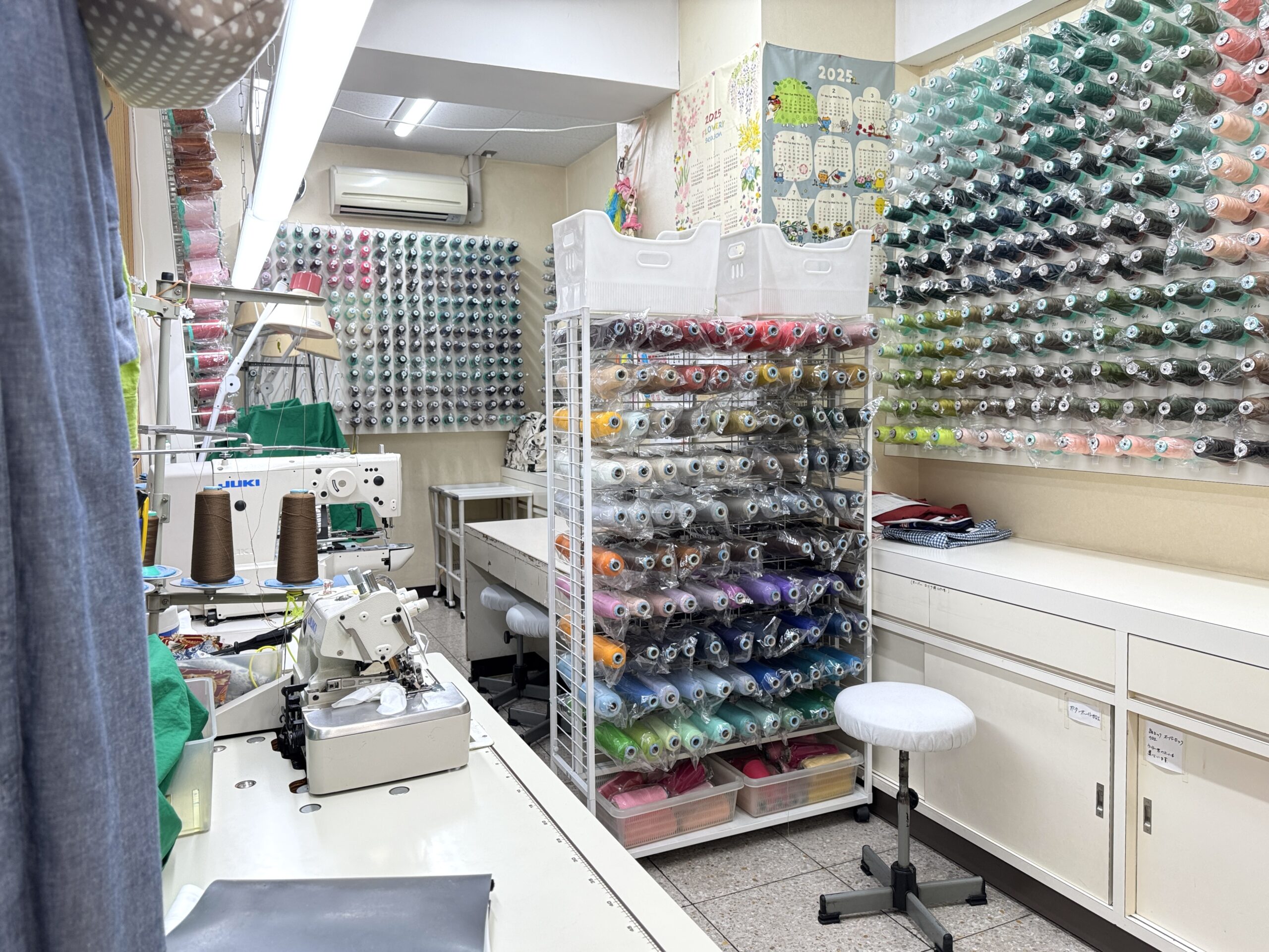 ミシン糸は家庭用・工業用問わず多ジャンルをご用意。この写真に写っているのはごく一部で、手縫い用や大サイズのシャッペスパンなど、カラーバリエーションも豊富です。