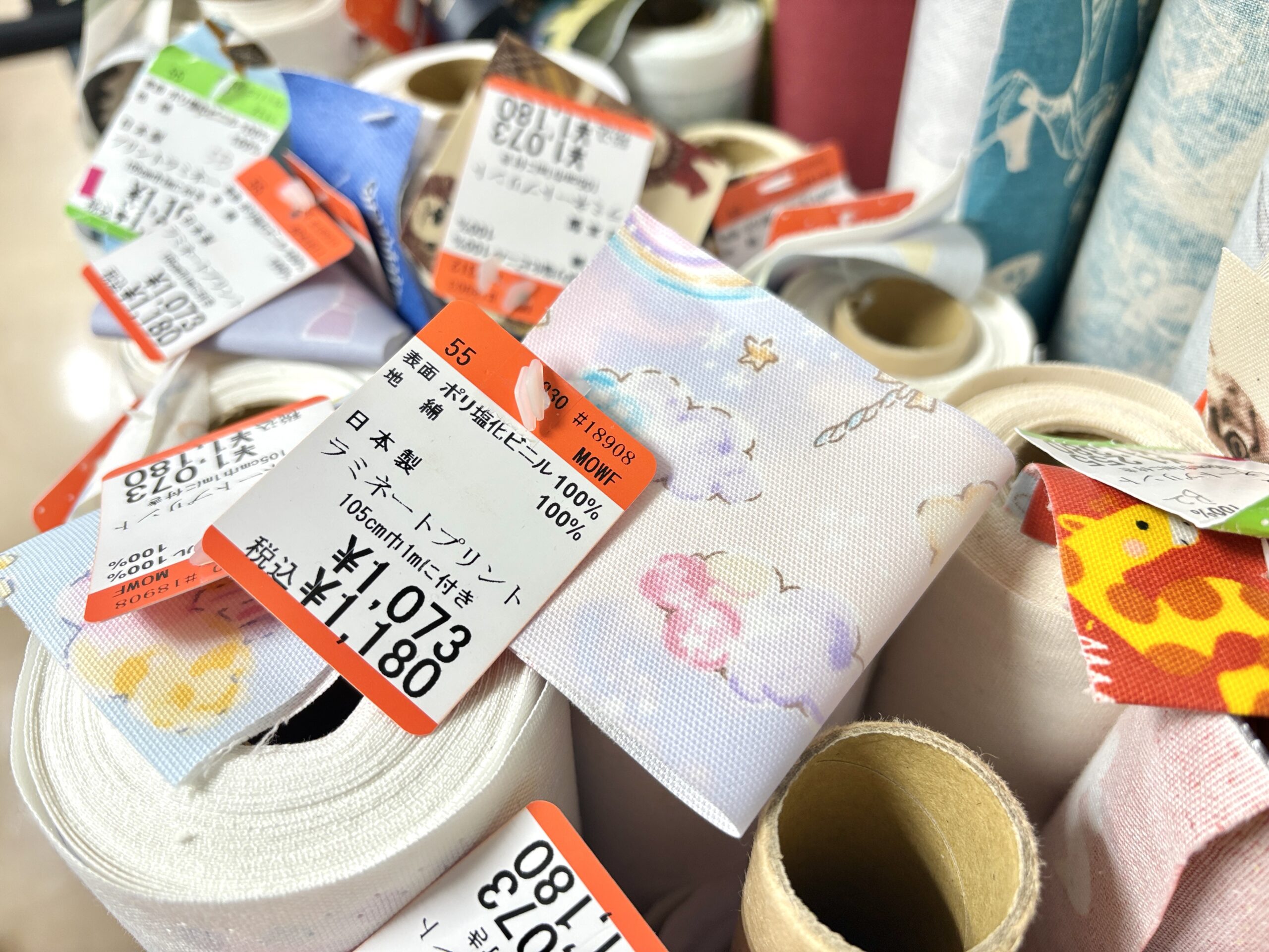 中でも、主にコットンプリント生地をビニールコーティングした「ラミネート生地」コーナーは、いつも以上に品数が豊富です。