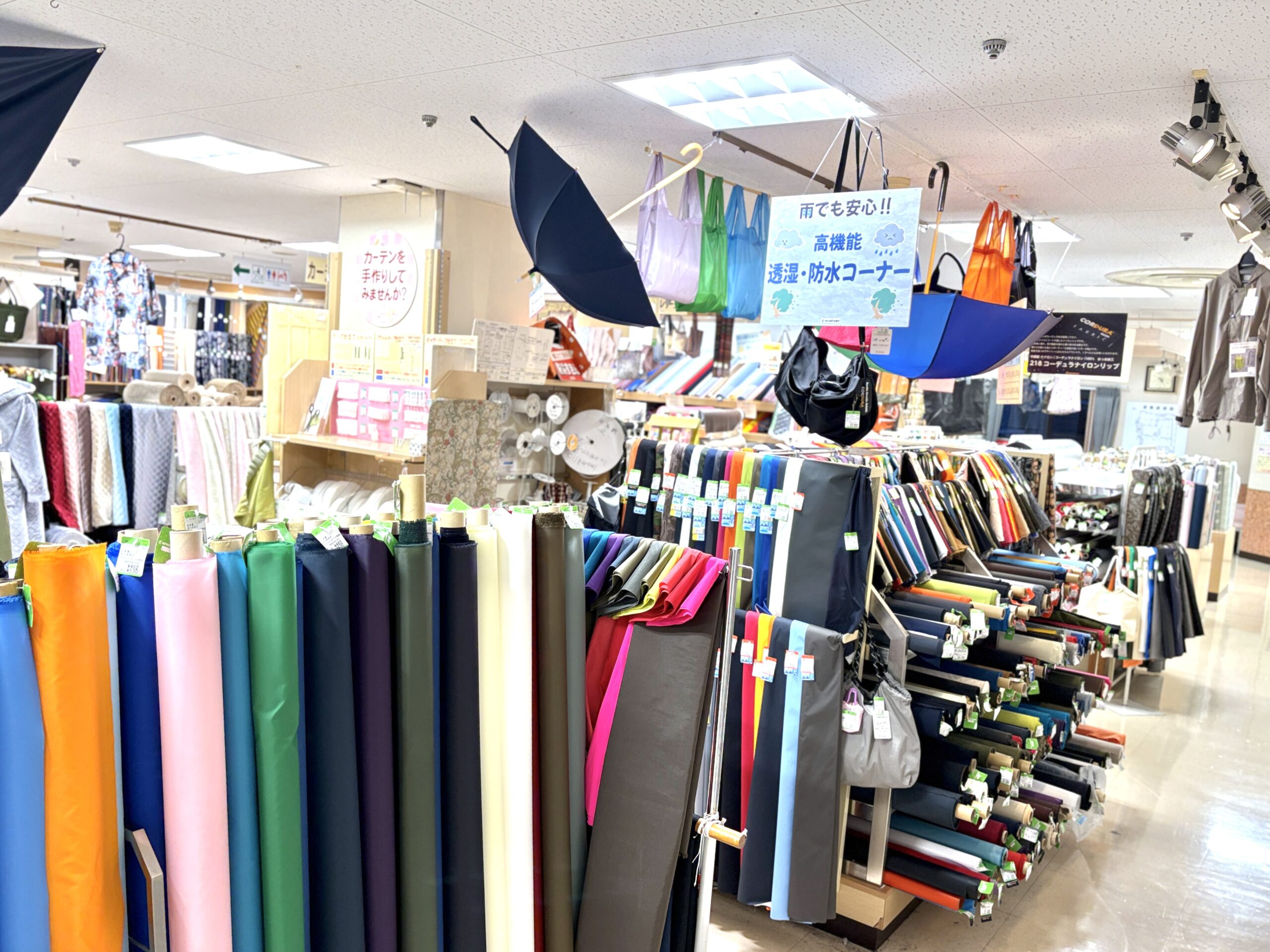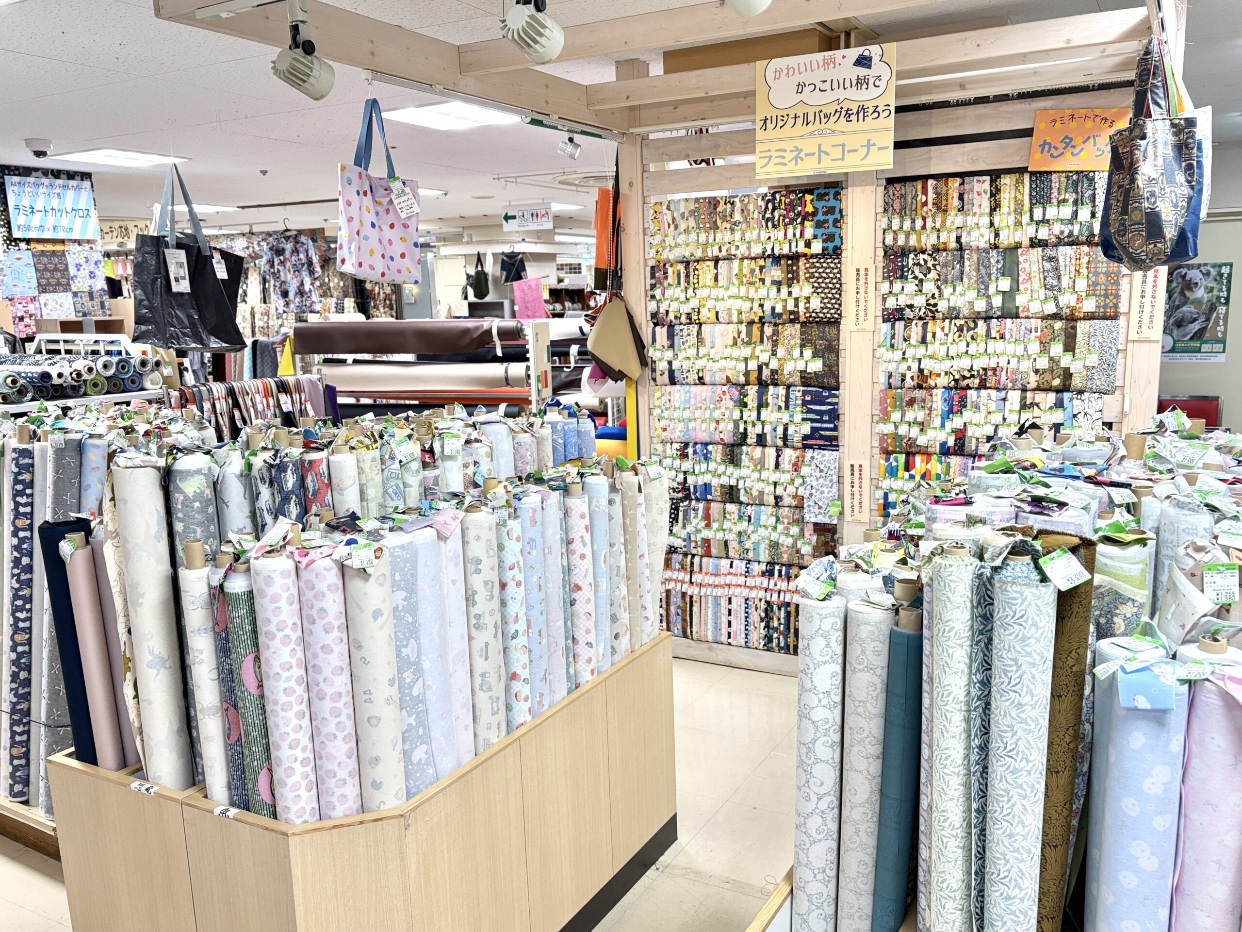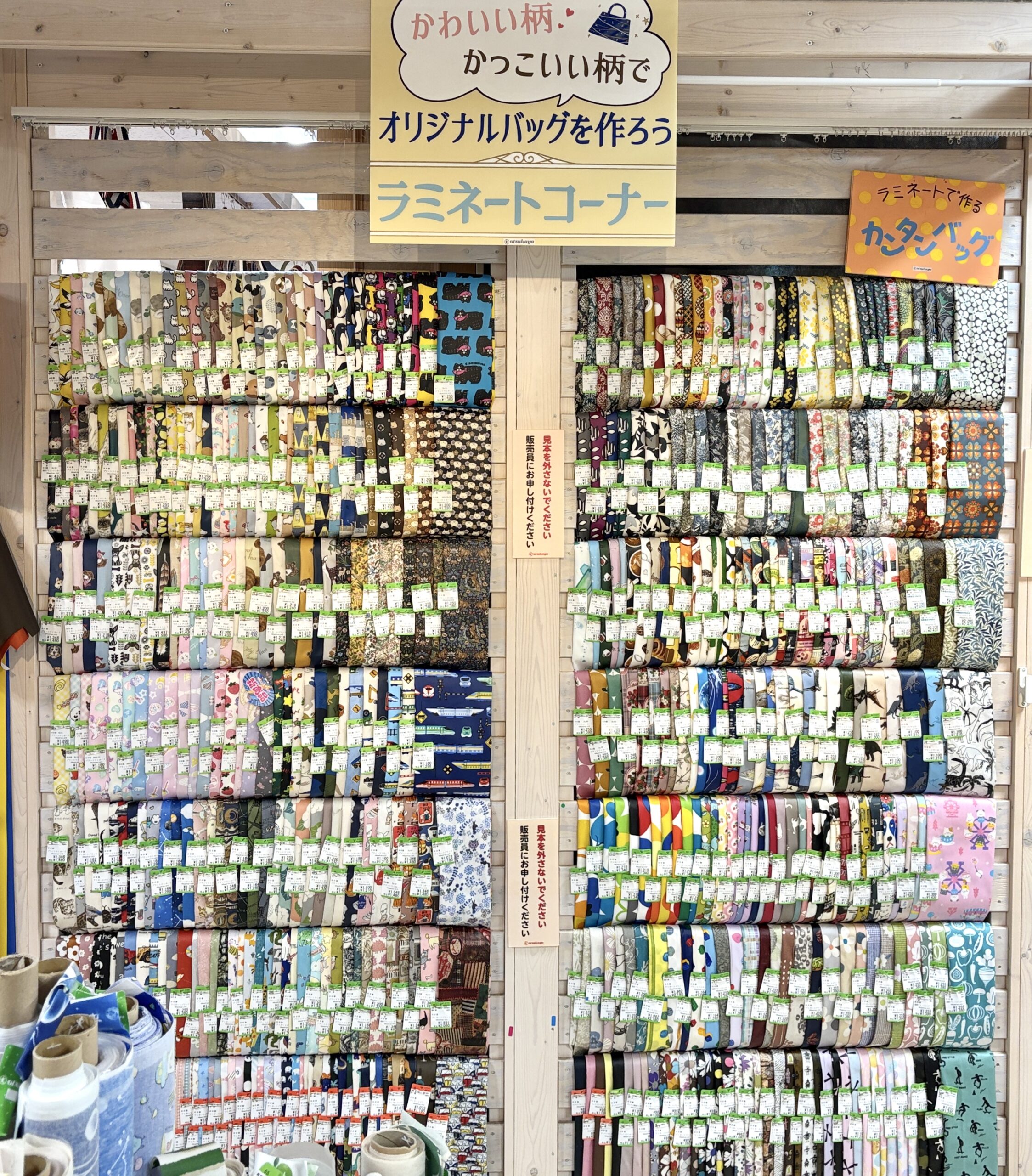 ラミネート生地は、名古屋は3階、大阪の江坂店は4階、岐阜店は1階で販売中です。(店舗によってラインナップは異なります)
