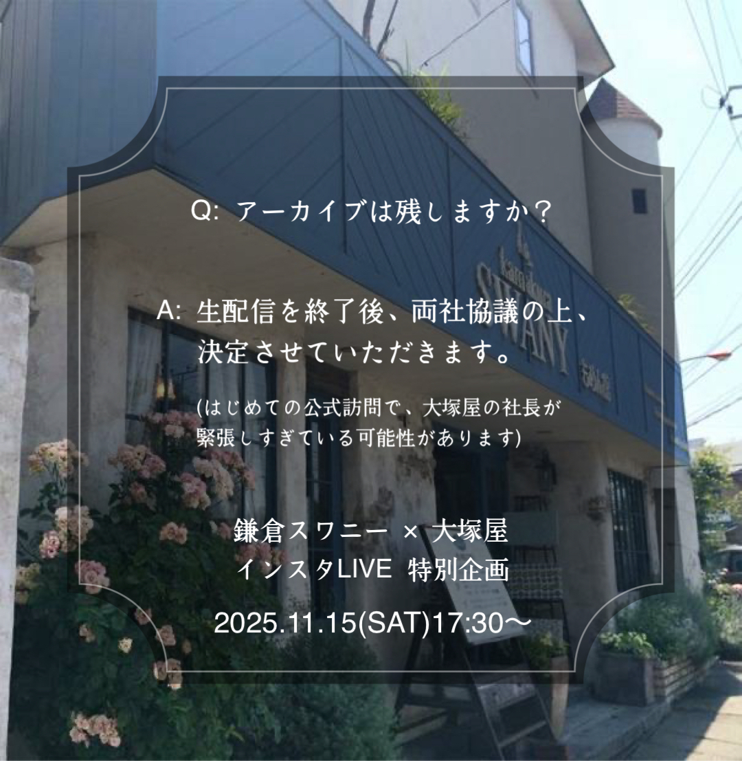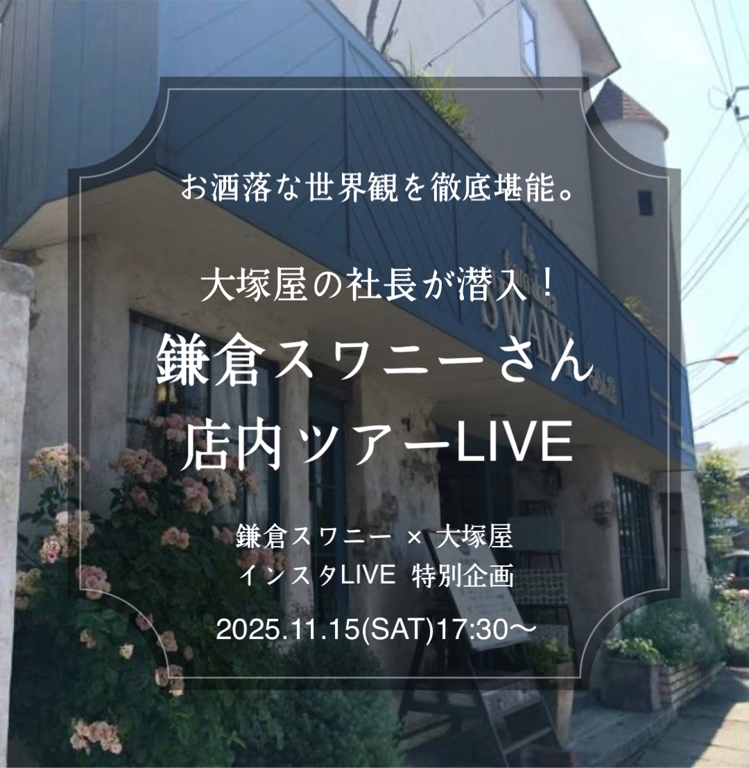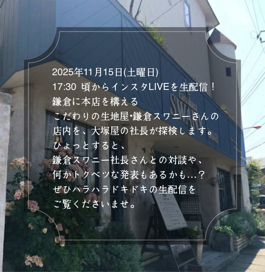 先日のブログで、湘南鎌倉に店舗を構える「鎌倉スワニー」さんと当店「大塚屋」のコラボライブ配信のお知らせをいたしました。