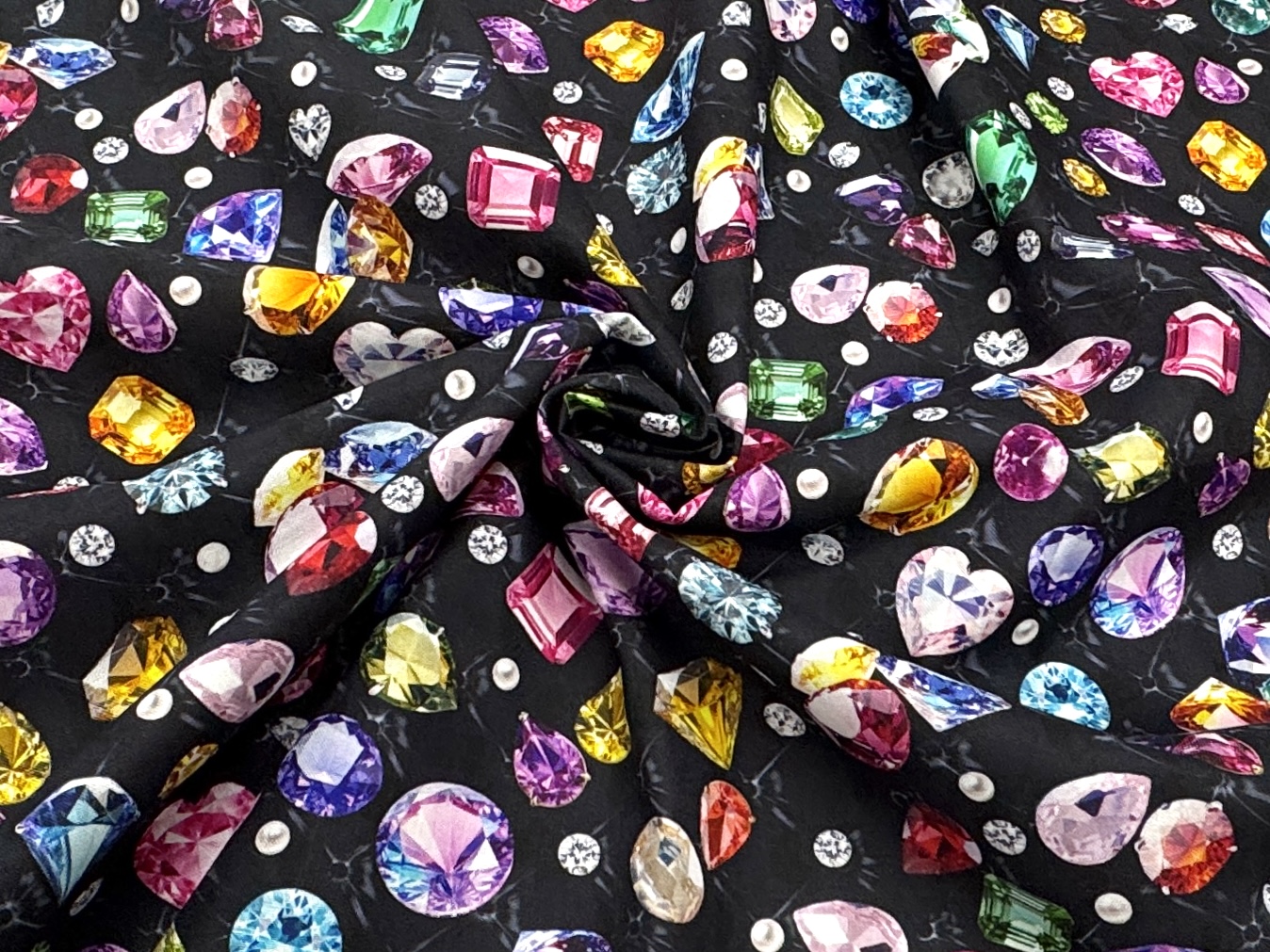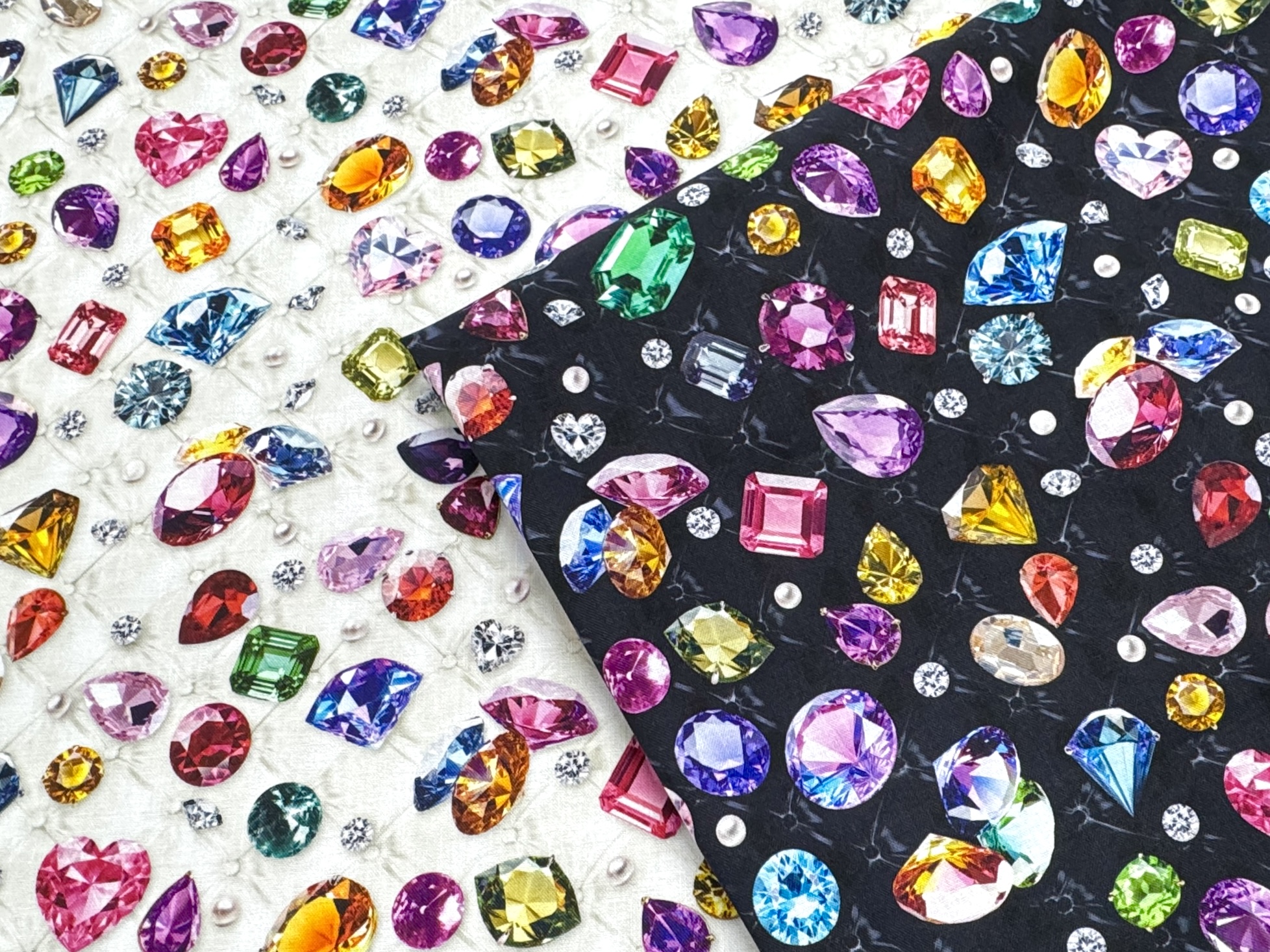 キラキラと輝く宝石たち。どこを切り取っても魅力的で美しく、うっとりした気分に。キルティングの背景に、色鮮やかな宝石、上品なパールがデザインされており、「バック」「ポーチ」「アクセサリーケース」などの小物作づくりから「ワンピース」などのお洋服づくりまで幅広くご使用いただけます。またレースやサテン生地と併せてのご使用もおすすめです。