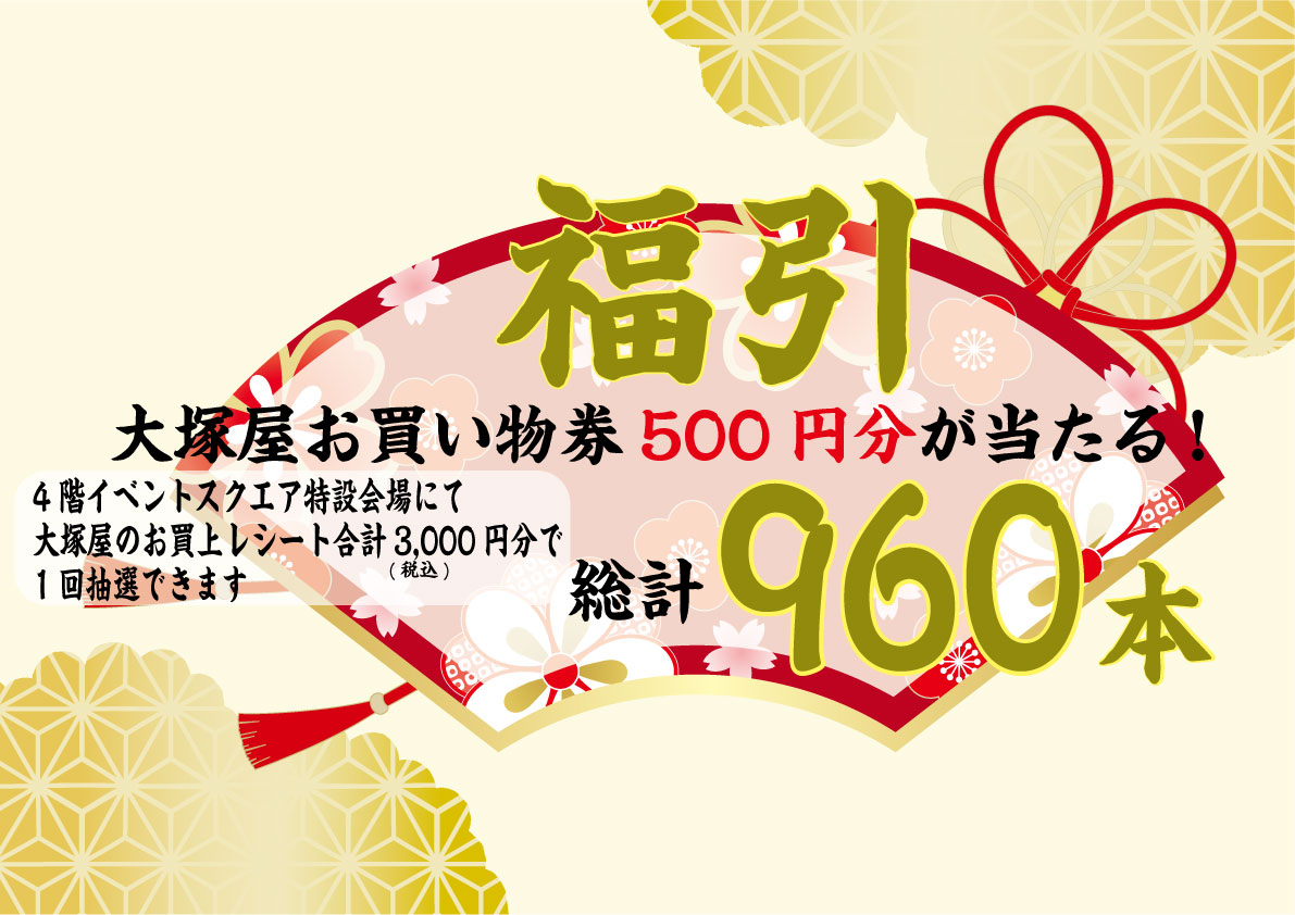 2026年の大塚屋は、1月3日(土)から「福奉仕品」「福袋」「福引き」をご用意の上、年始バーゲンを開催します!