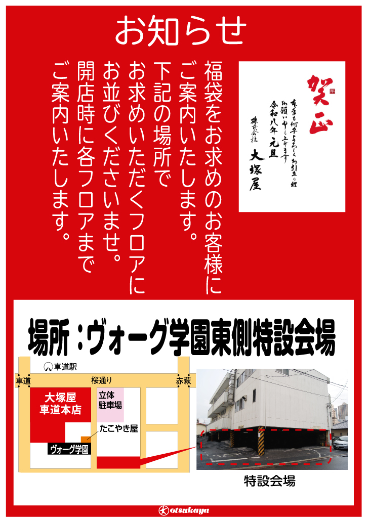 なお、車道本店の福袋につきましては、1月3日の開店前に以下の場所にお越しください。開店後、各フロアへとご案内いたします。