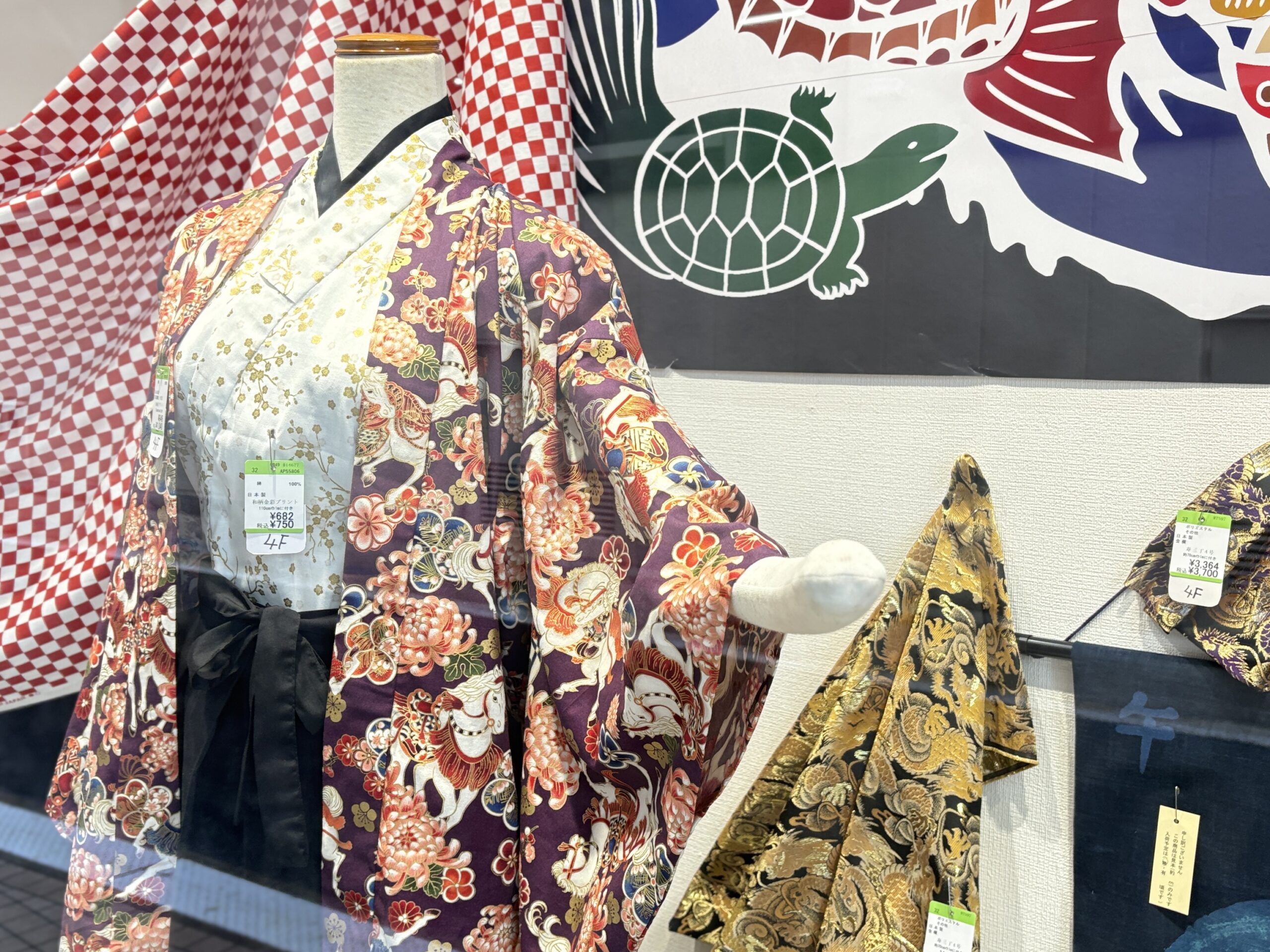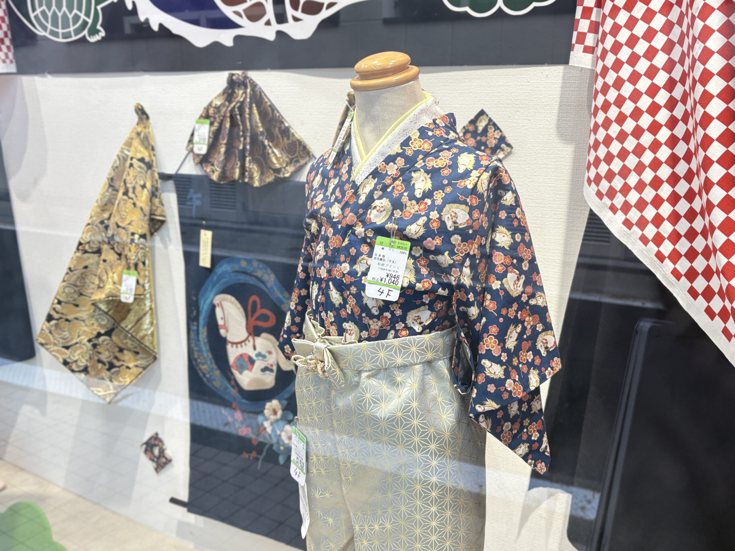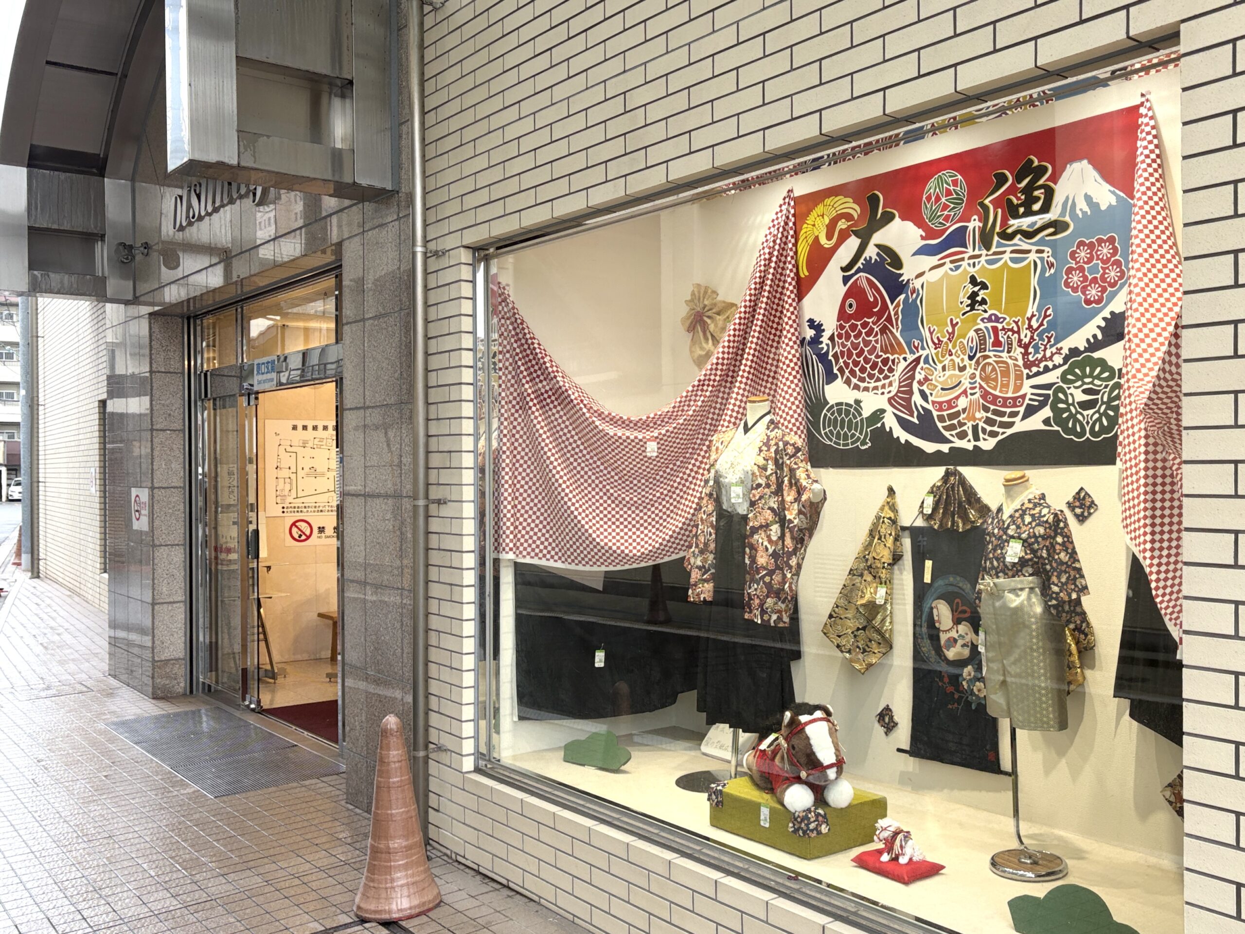 「大漁旗」の下には和の装いのマネキンが並びます。