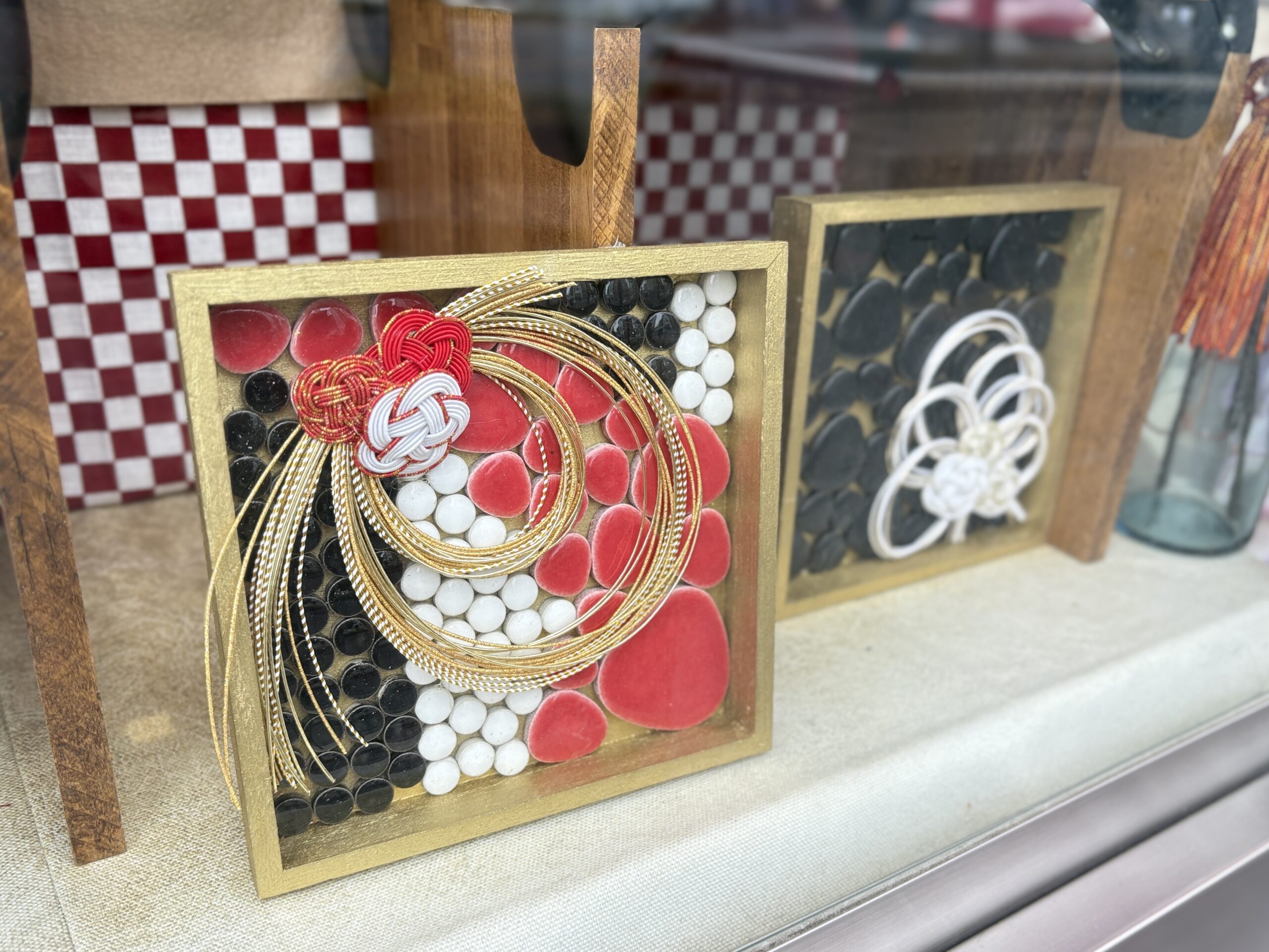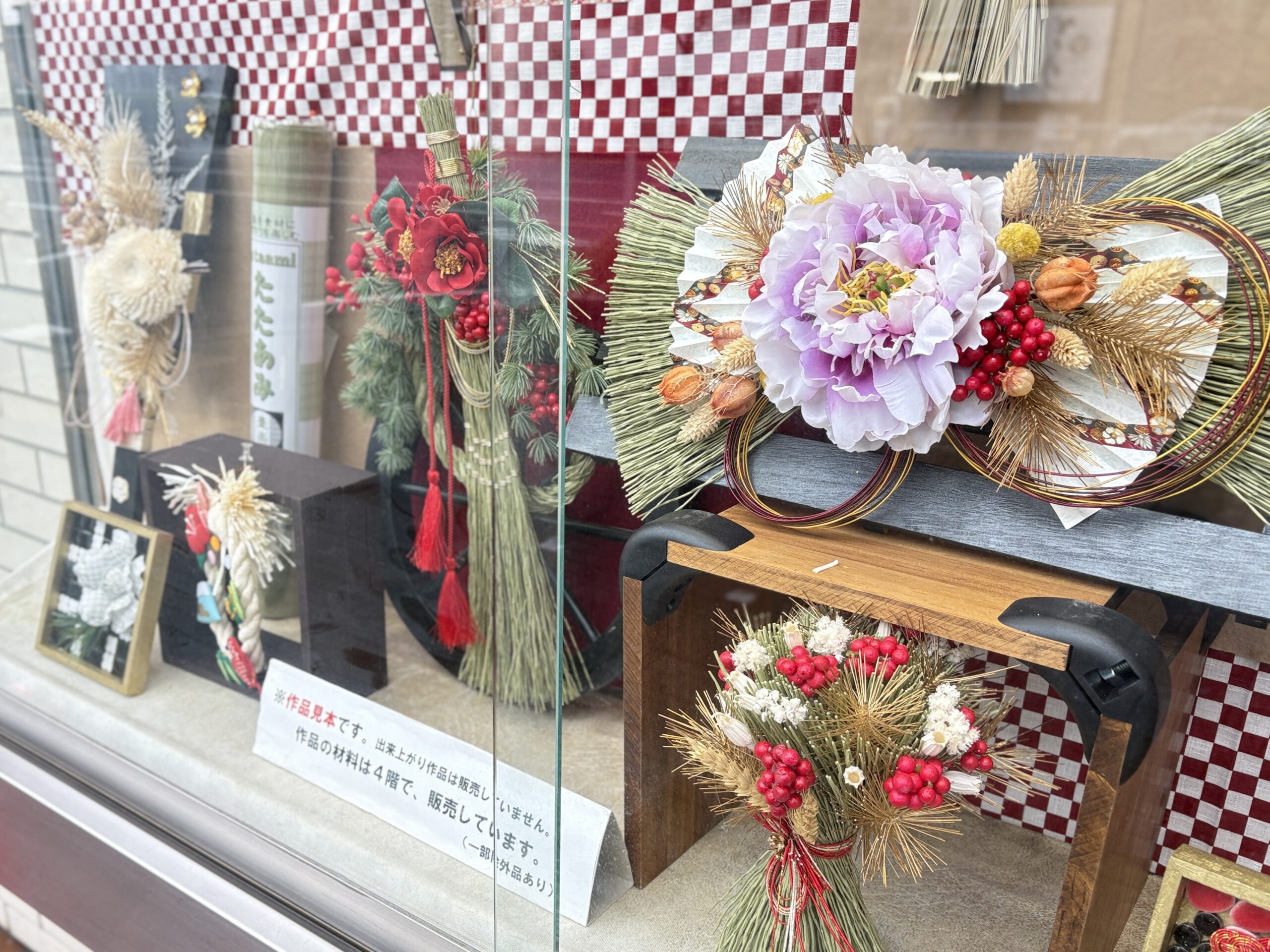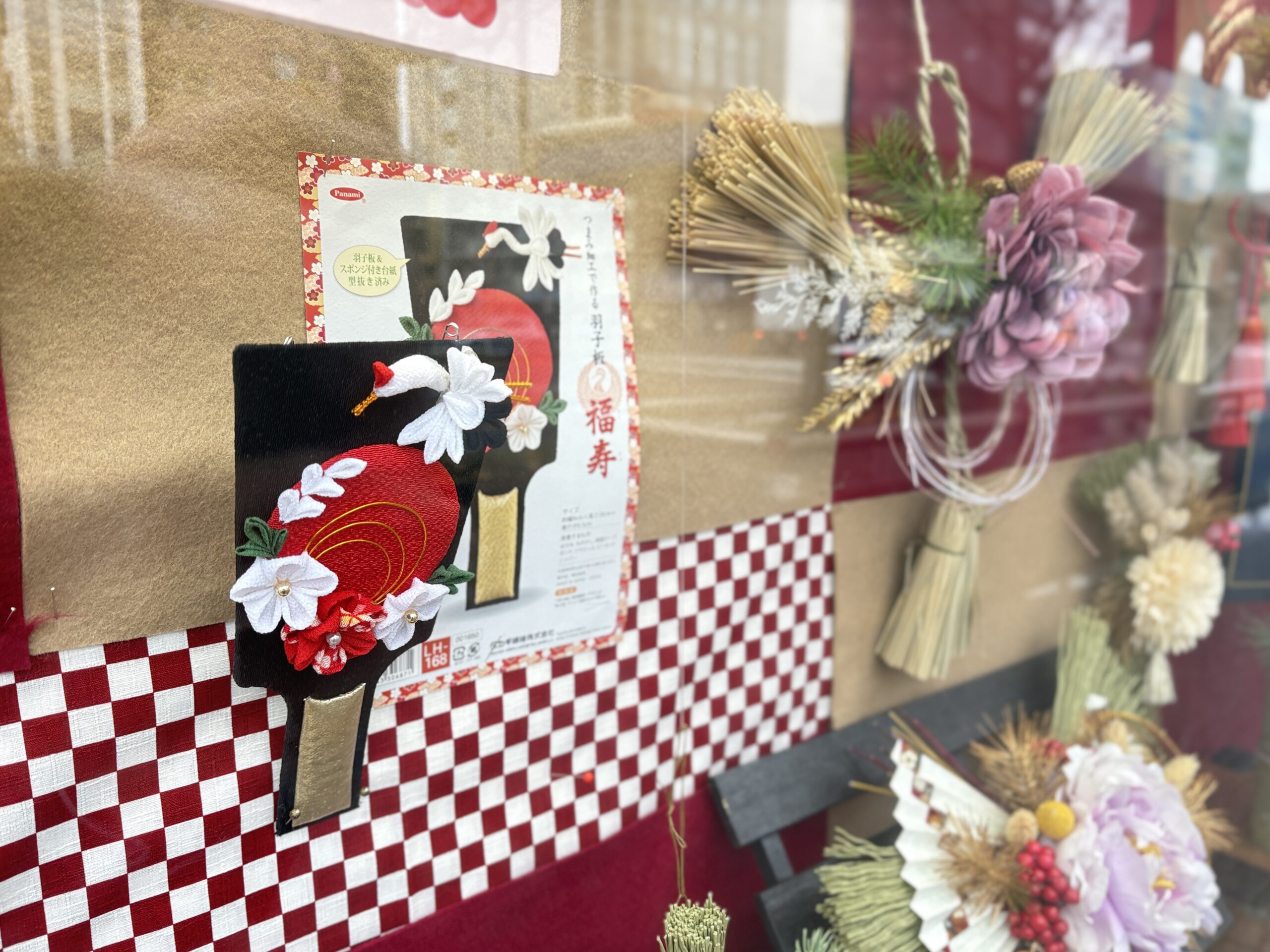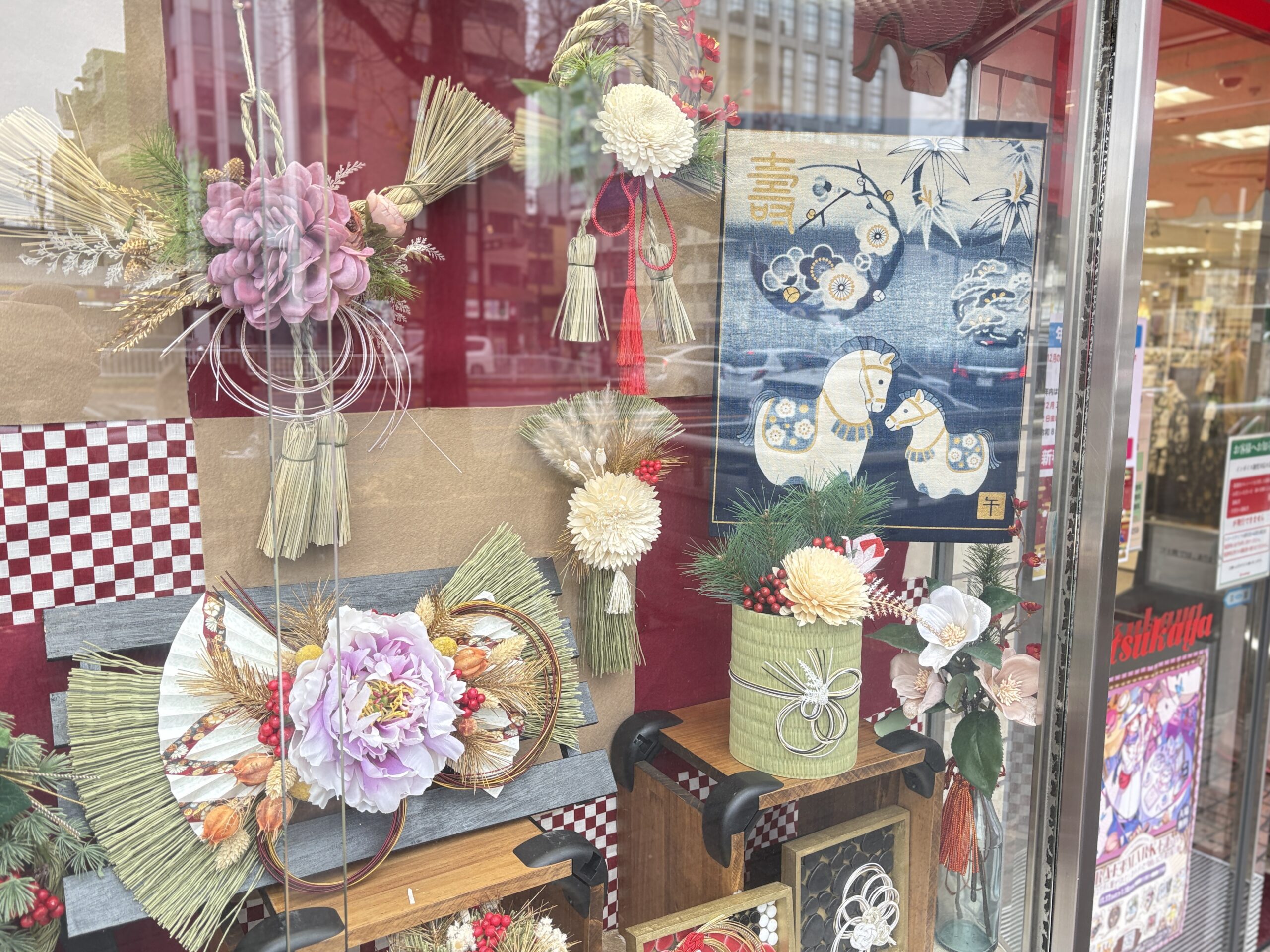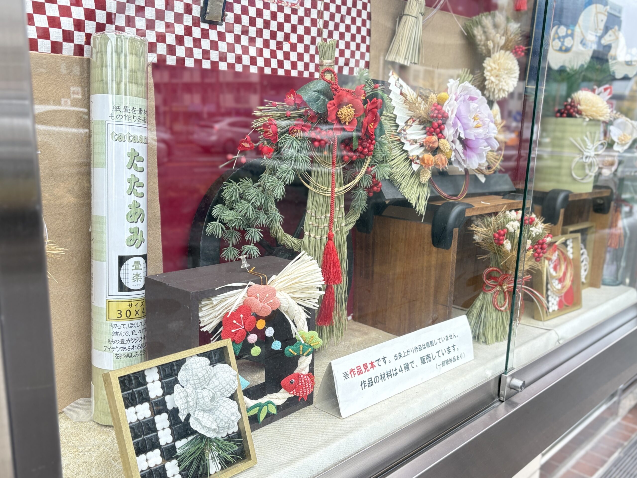 桜通り沿いの小ウインドウには、4階クラフトコーナーのお正月アイテムが飾られています。
