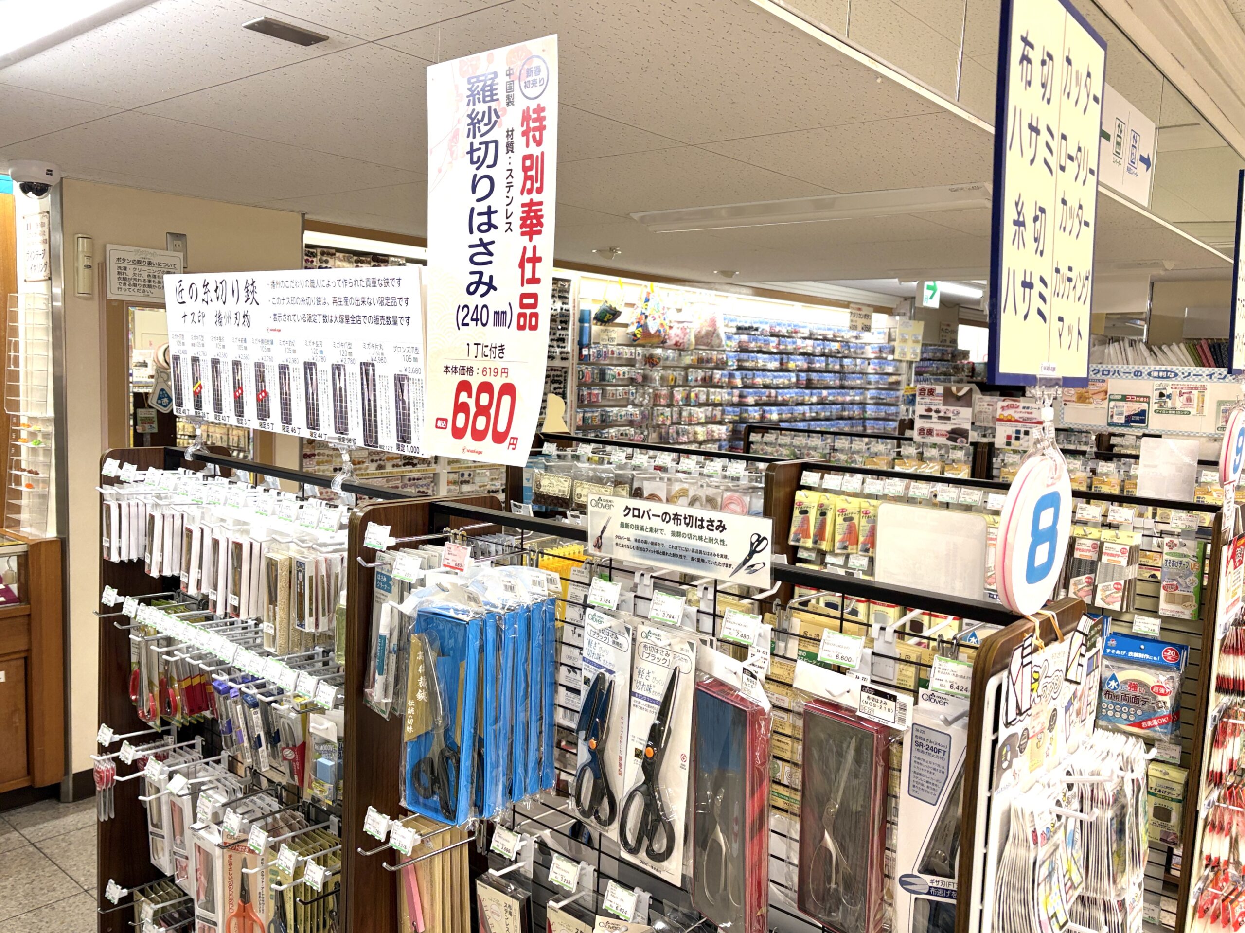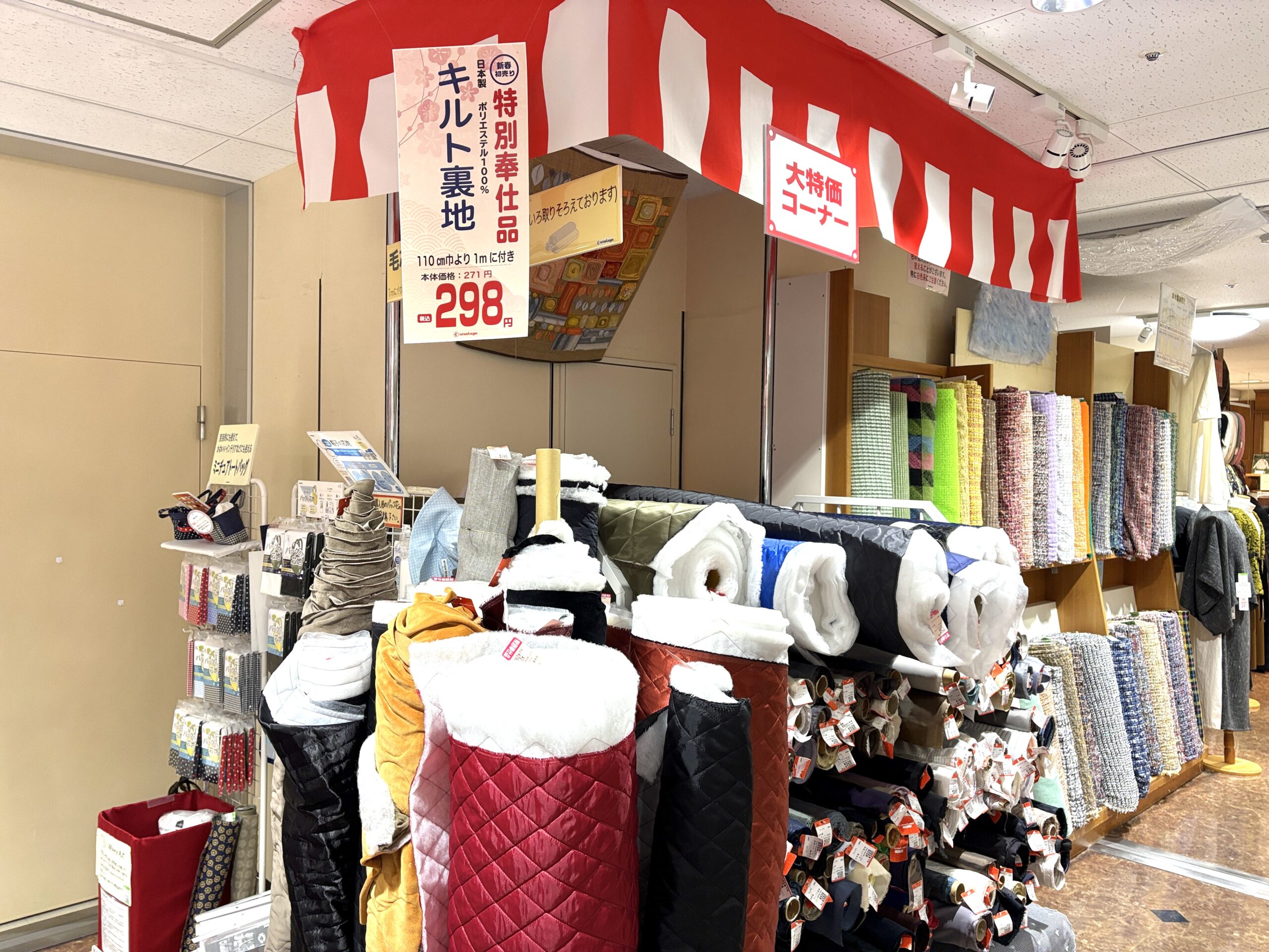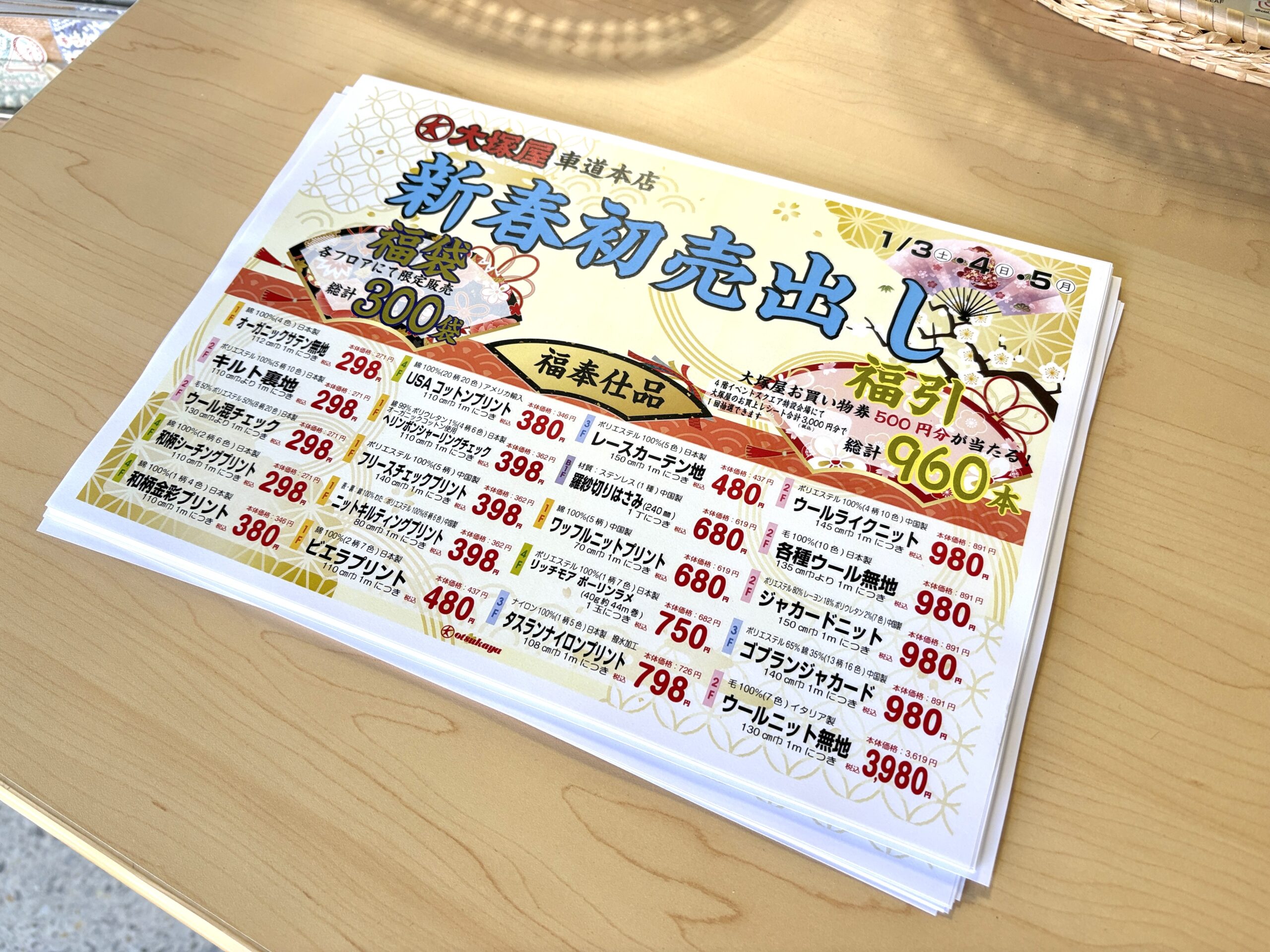 ぬのにちは♪大塚屋車道本店でございます。ここは、立体駐車場横の大ウインドウ。新年を迎えるにあたって、お正月をイメージしたディスプレイで飾っています。「大漁旗」の下には和の装いのマネキンが並びます。桜通り沿いの小ウインドウには、4階クラフトコーナーのお正月アイテムが飾られています。おや・・・その横の入り口に、なにか掲示してあるようです。\ ズーム・イン! /そこに記されていたのは、「新春初売出し開催」のご案内でした!2026年の大塚屋は、1月3日(土)から「福奉仕品」「福袋」「福引き」をご用意の上、年始バーゲンを開催します!\ お買い得商品もいっぱい! /こちらは車道本店の内容につきまして、岐阜