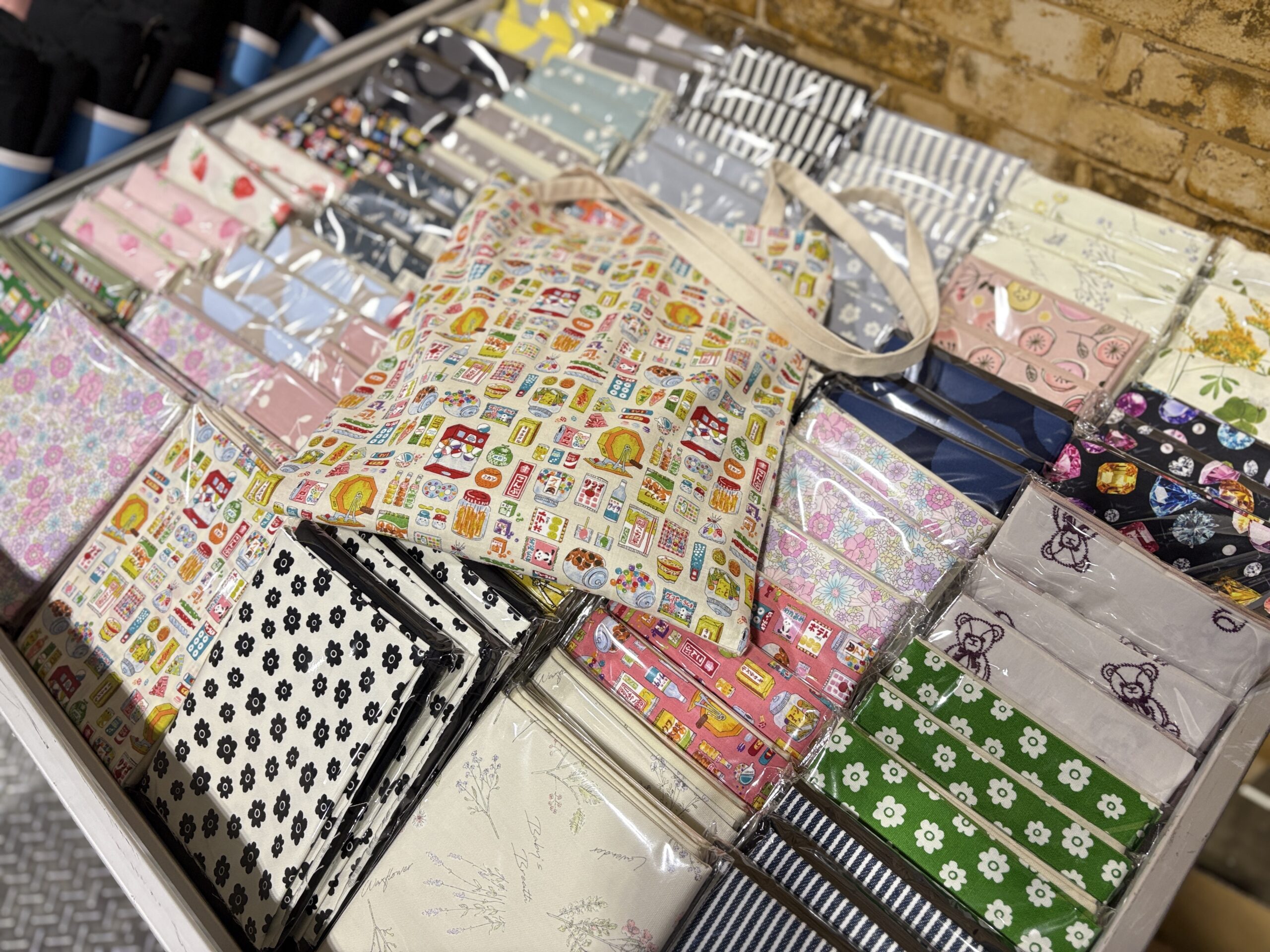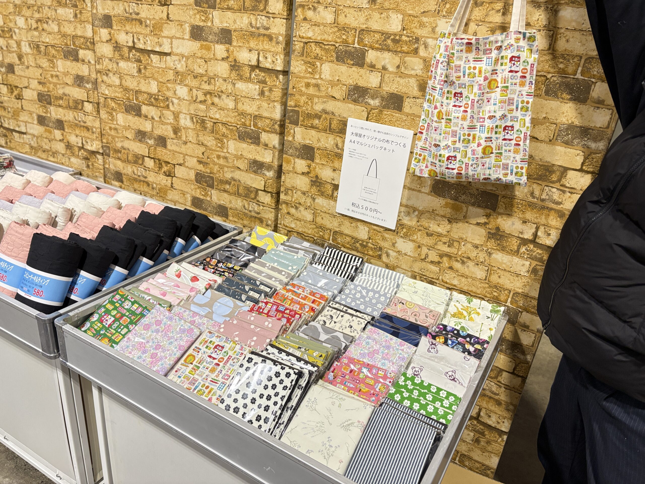 ぬのにちは♪大塚屋車道本店でございます。今週末にポートメッセなごやで開催予定の「クラフトマーケット」。イベント詳細につきましては、昨日のブログをご覧ください。そのイベントで初お披露目をいたしますのが、「大塚屋オリジナル・A4マルシェバッグキット」です。キットの原案となっているのは、大塚屋江坂店3階で販売中のレシピ「マルシェBagの作り方」です。こちらのレシピは、直線縫いのみで仕上げられるお手軽仕様で、今回の駄菓子柄のバッグも「上糸・下糸を、なんとかミシンにセットできるレベル」の初心者スタッフでも仕上げることができました。そしてできあがった作品は、A4サイズの資料を持ち運ぶのに使い勝手抜群です。