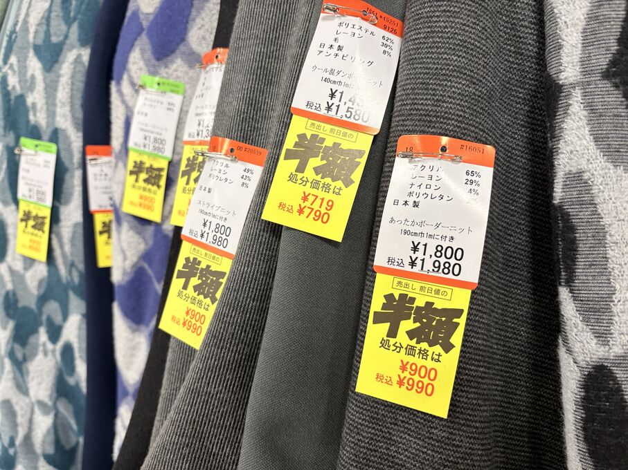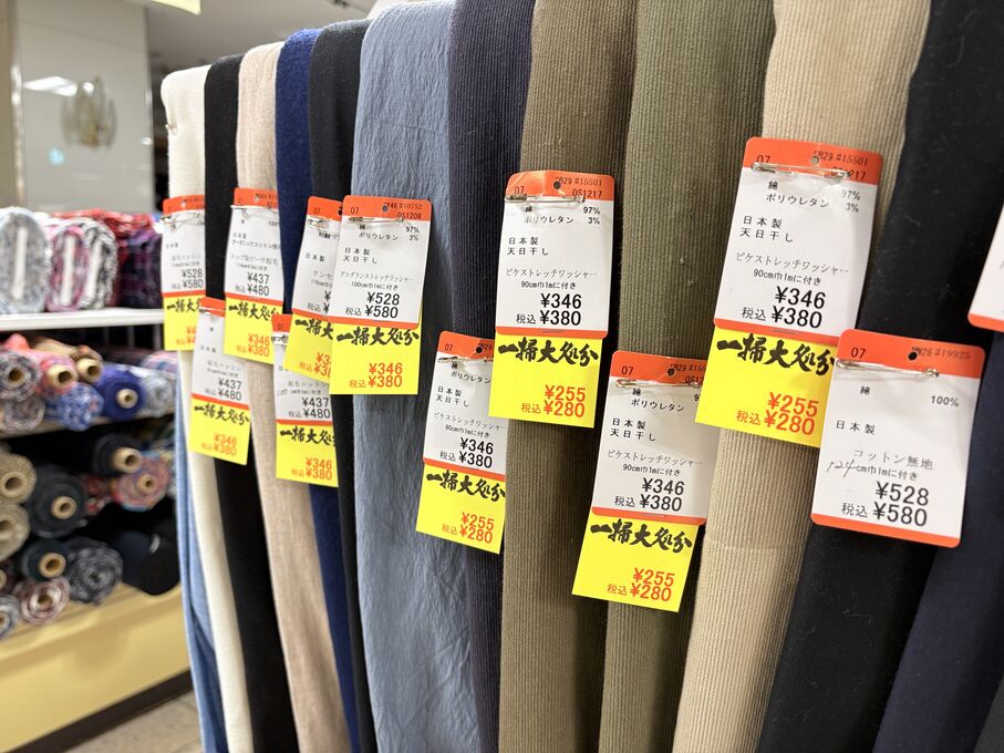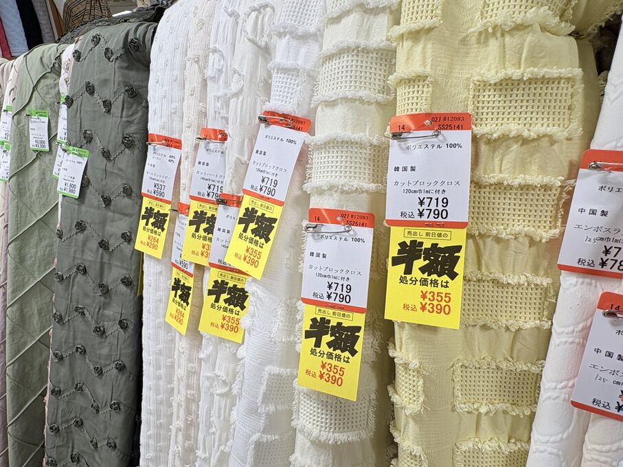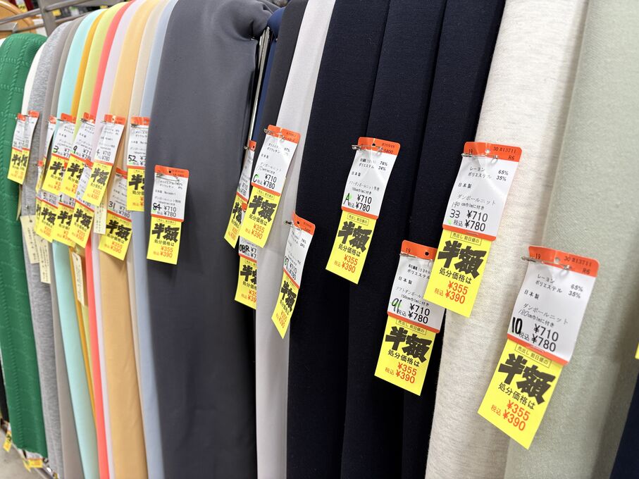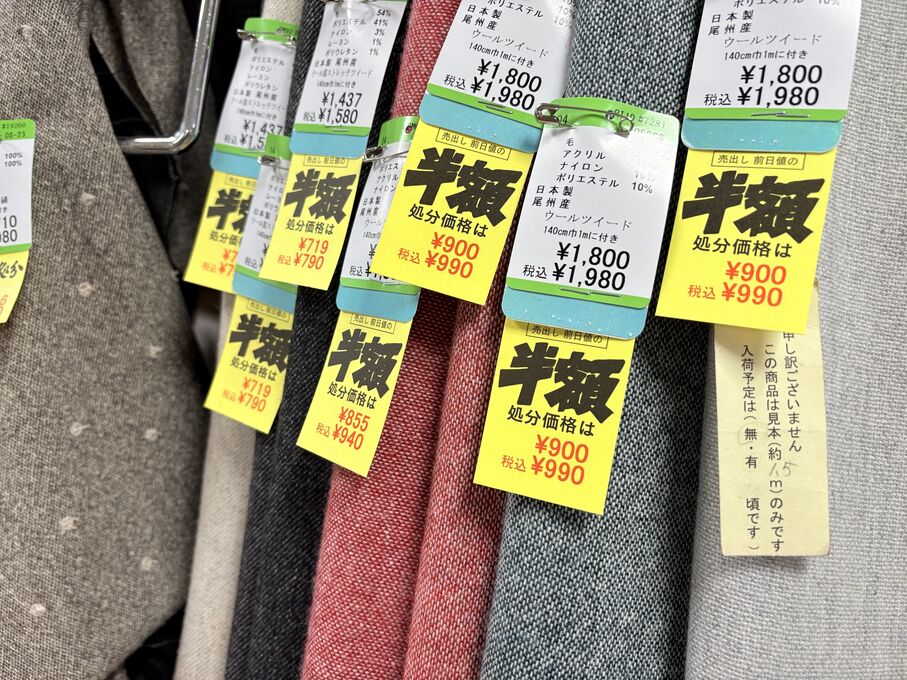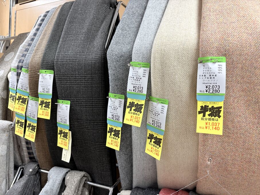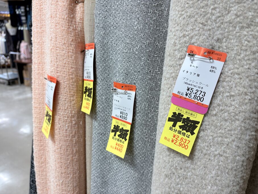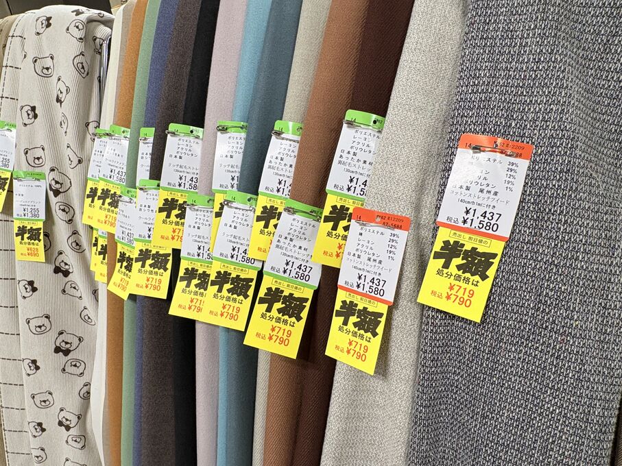 ぬのにちは♪大塚屋でございます。2026年1月30日~2月4日の6日間、大塚屋車道本店・江坂店・岐阜店で「冬の布地一掃大処分」のバーゲンセールを開催いたします。セール商品には、このように通常の値札の下に「黄色い特価札」を添付します。さらにくわしくは、開催直前に大塚屋実店舗のホームページ()のお知らせ欄に記載予定です。また、開催前日の1月29日(木)は全店舗定休日となりますが、以下の時間で商品紹介ライブの配信を予定しています。■2026年1月29日(木) 夜19時頃~(1時間半程度)大塚屋車道本店の店内で、弊社代表の大塚がお買い得商品を探索!生配信をしながら、4階 → 3階 → 2階 → 1階
