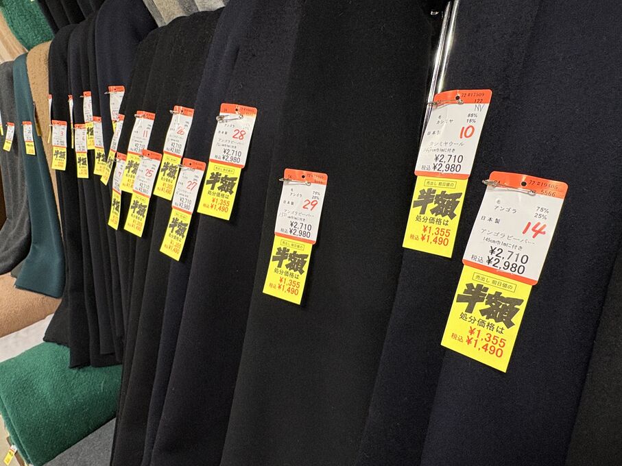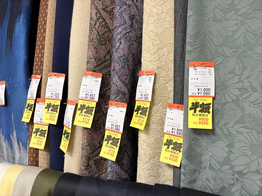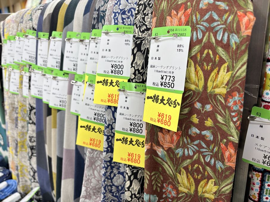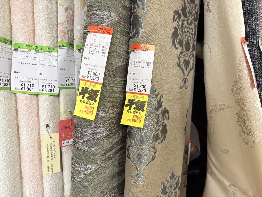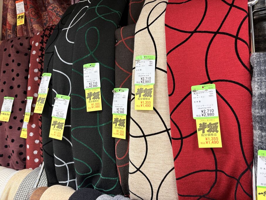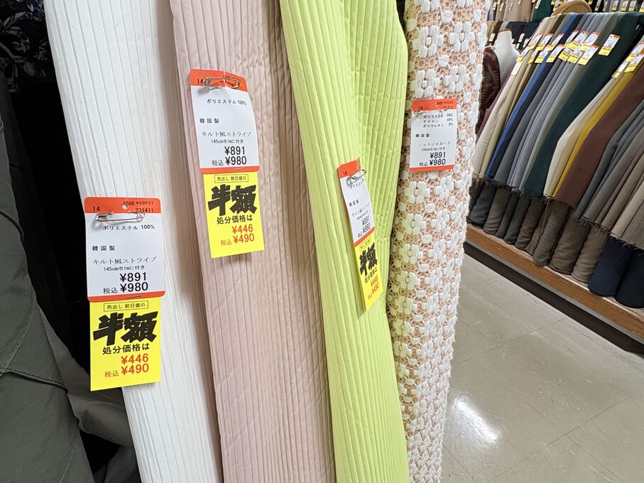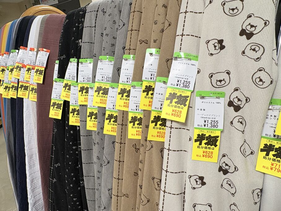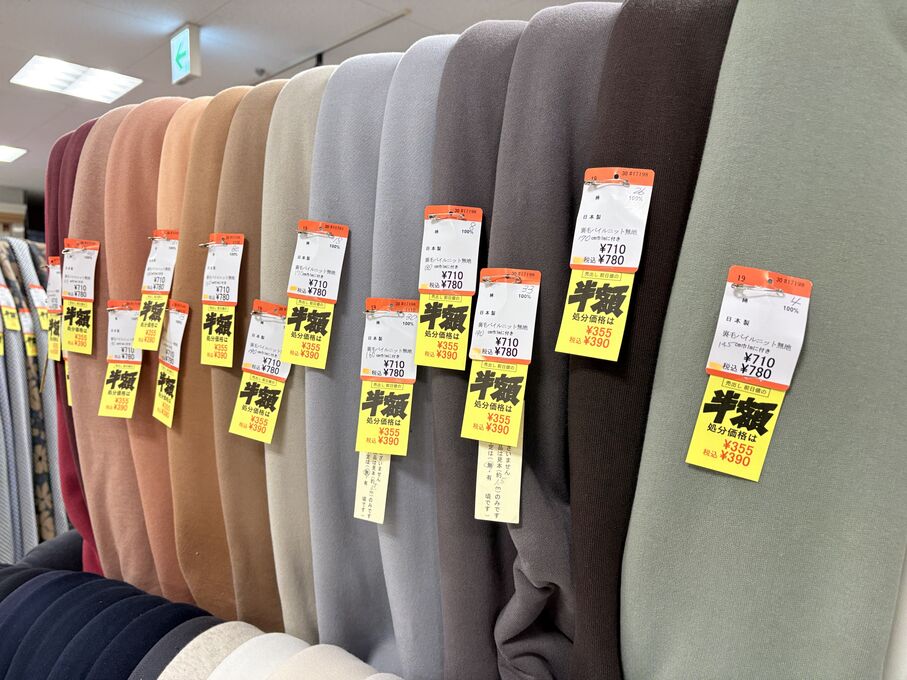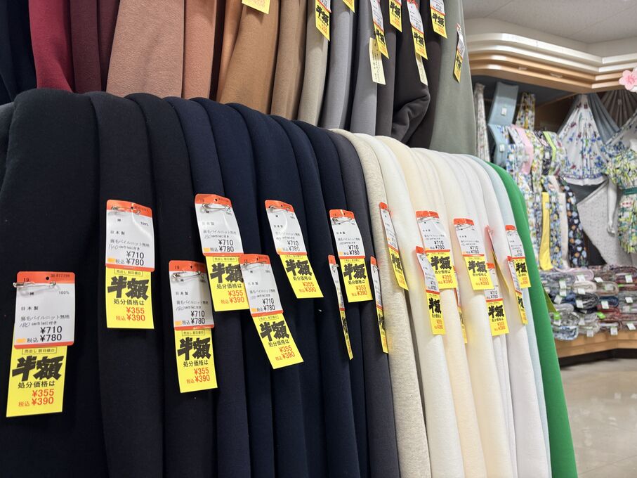 ぬのにちは♪大塚屋でございます。2026年1月30日~2月4日の6日間、大塚屋車道本店・江坂店・岐阜店で「冬の布地一掃大処分」のバーゲンセールを開催いたします。セール商品には、このように通常の値札の下に「黄色い特価札」を添付します。さらにくわしくは、開催直前に大塚屋実店舗のホームページ()のお知らせ欄に記載予定です。また、開催前日の1月29日(木)は全店舗定休日となりますが、以下の時間で商品紹介ライブの配信を予定しています。■2026年1月29日(木) 夜19時頃~(1時間半程度)大塚屋車道本店の店内で、弊社代表の大塚がお買い得商品を探索!生配信をしながら、4階 → 3階 → 2階 → 1階