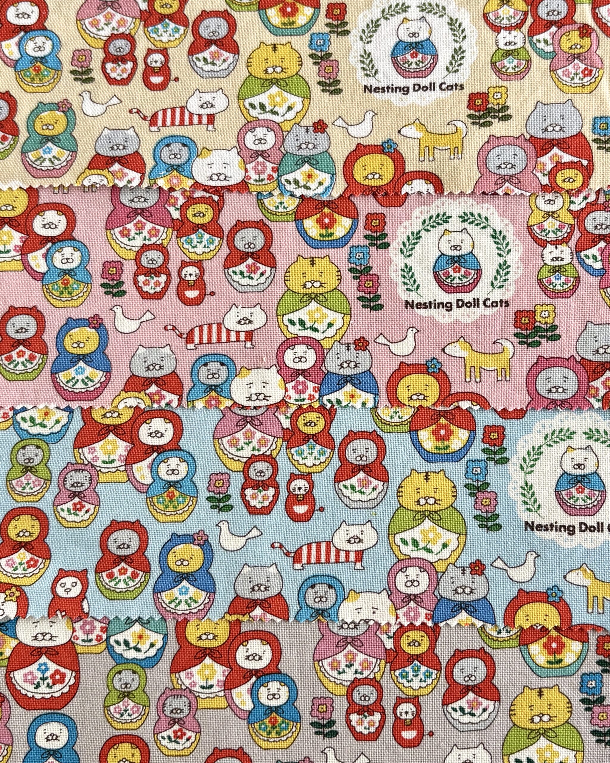 カラフルなマトリョーシカに身を包んだ、ネコさんたち!生地に記されているNesting doll(ネスト・ドール)というのも「マトリョーシカ」を意味しています。