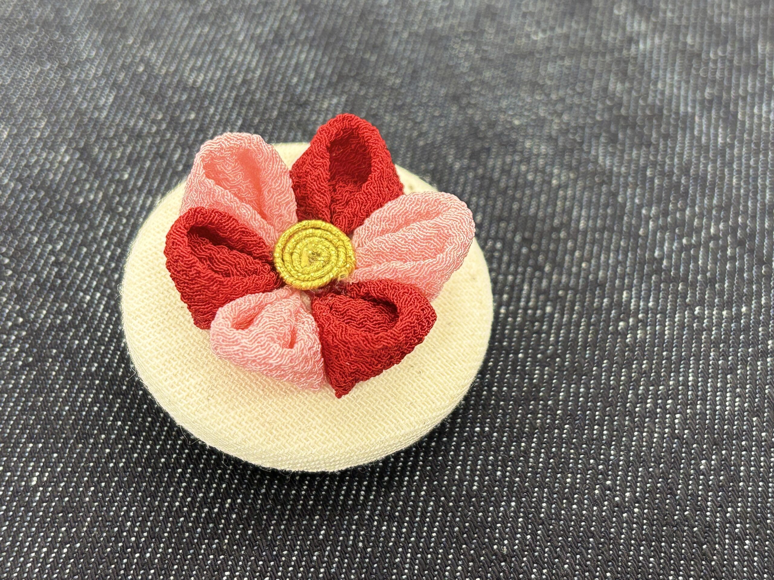 最初はピンセットの使い方や畳み方、ボンドの付け具合など、ワタワタしていましたが、6枚の花びらの形を繰り返し作っていくことでだんだんと楽しくなってきました。そして、ちいさなちりめん生地が、次第に形となっていくことに感動を覚えました。