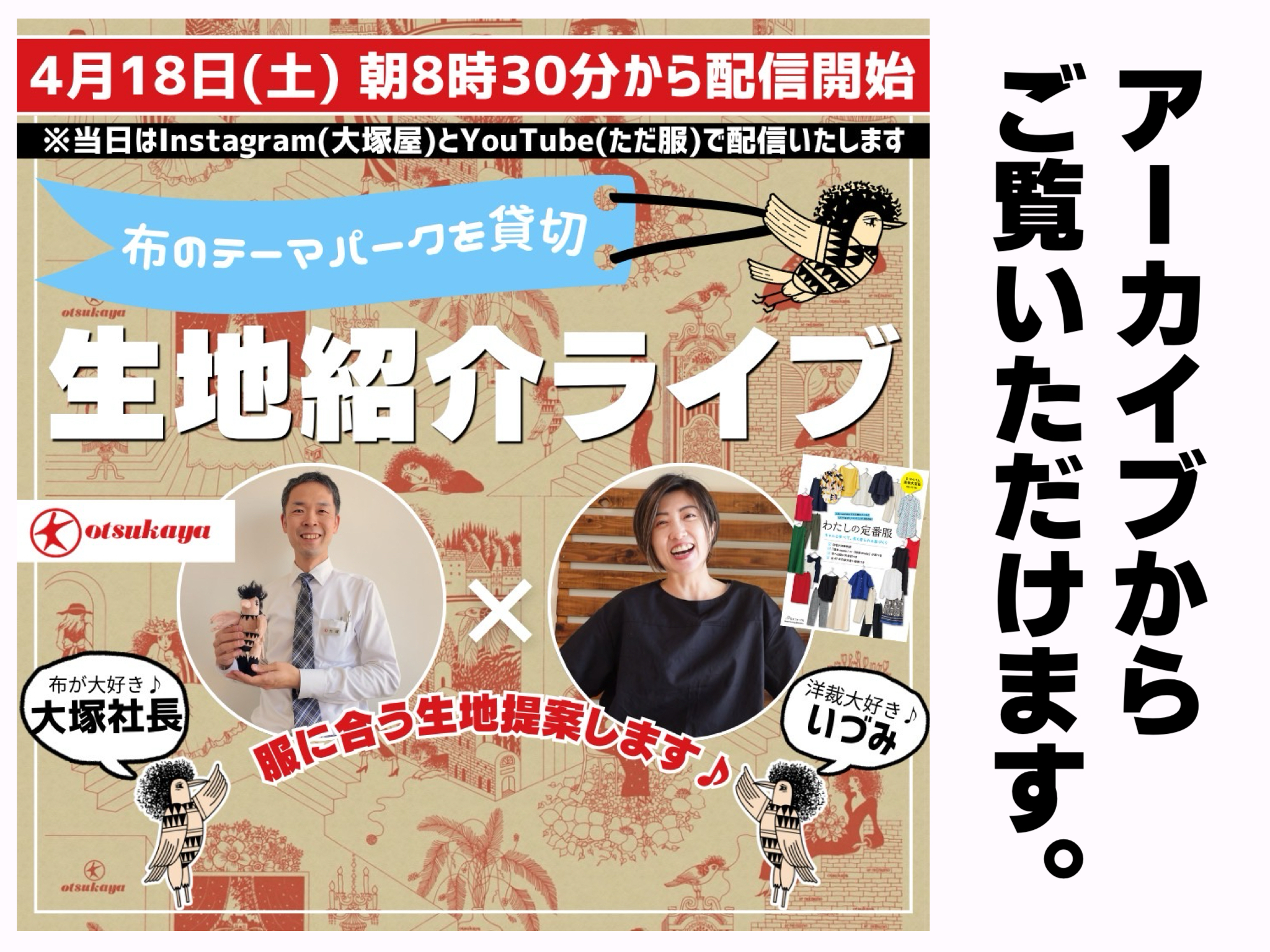 ただ服さんはYouTubeライブから、大塚屋はInstagramアカウントからの配信で、朝早くからにもかかわらず、多くのご視聴ありがとうございました!(ただ服さんは、なんとライブ配信のために始発で遠方より新幹線で名古屋にお越しくださいました。ありがとうございます!)