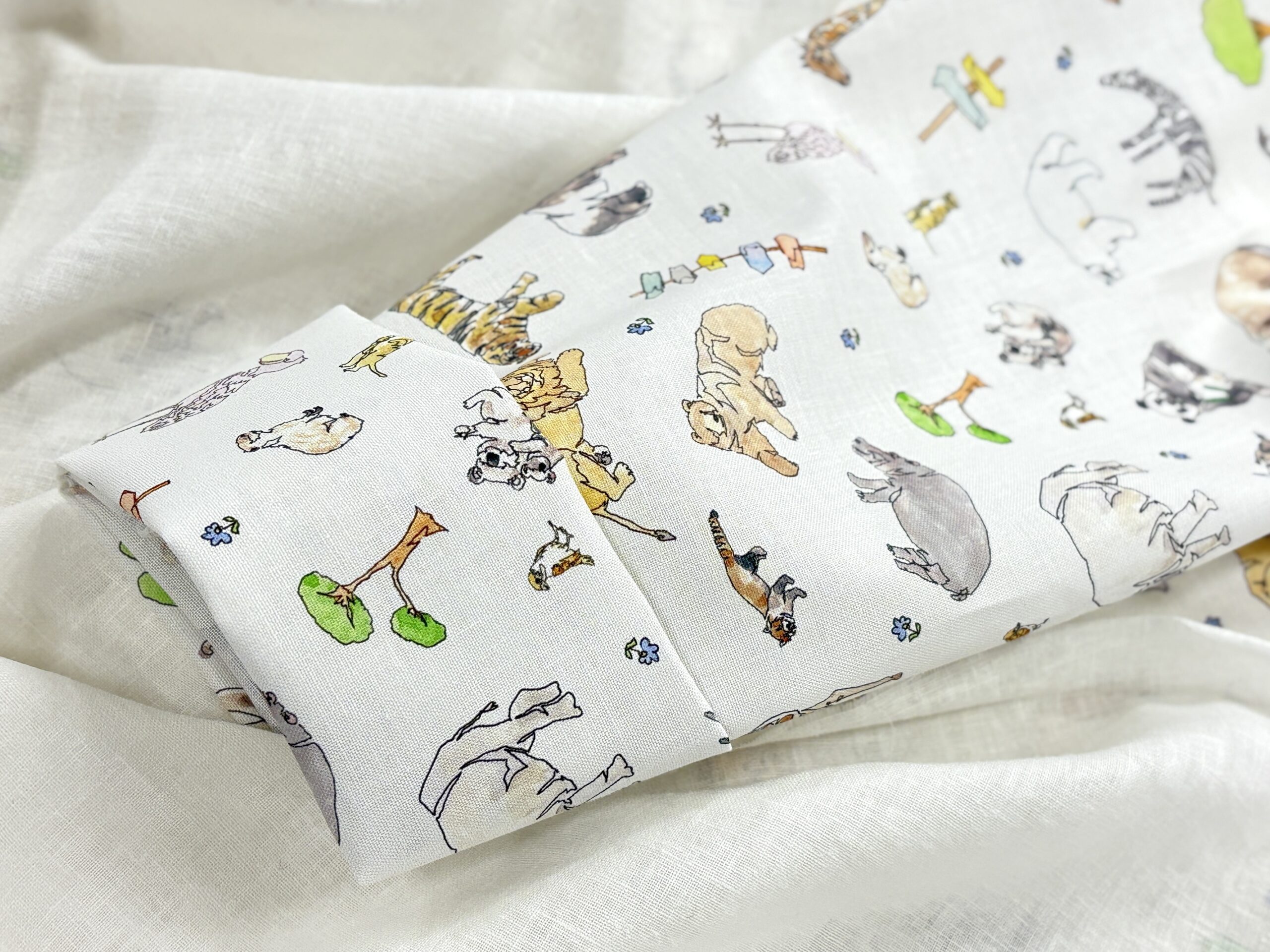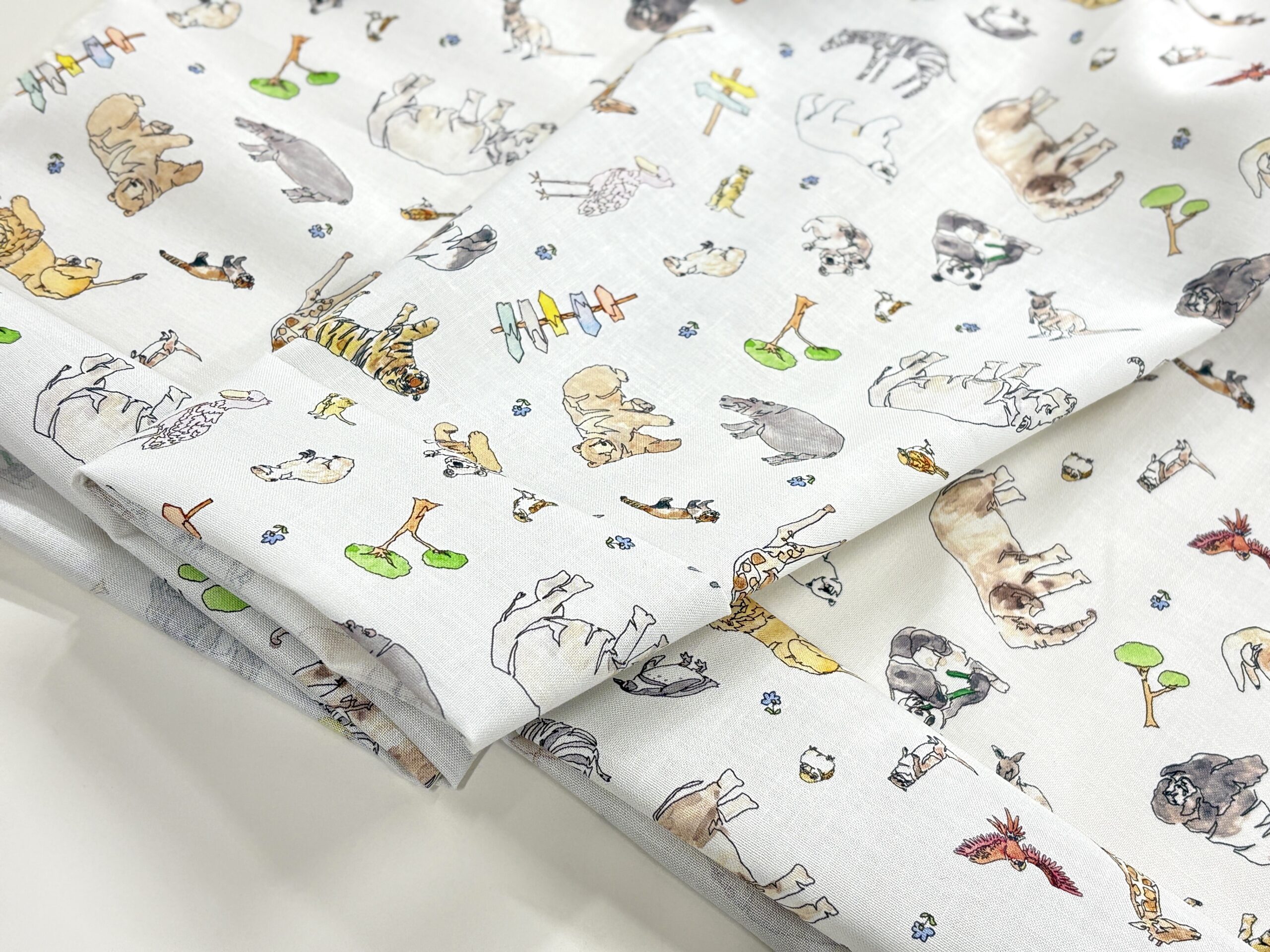 こちらの布地は、ひとふでがき作家 minaco samamotoさんのシーチングプリント生地「ひとふでがき動物園」です。
