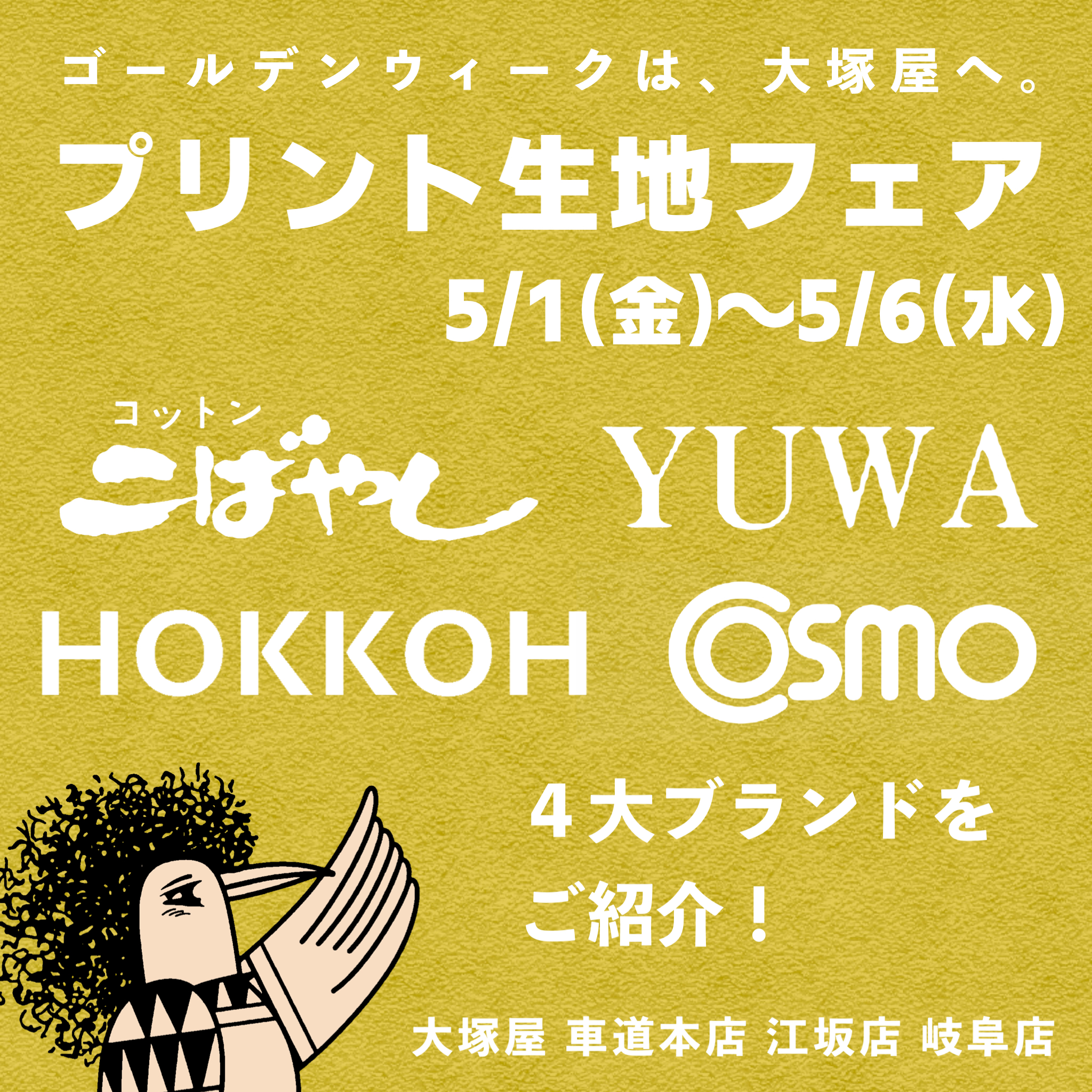 今回フェア対象となるのは、昨年に引き続き「コットンこばやし」さん、「YUWA」さん、「HOKKOH」さん、そして今年から新たに加わる「COSMO」さんの生地です。