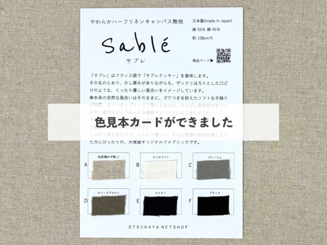 ぬのにちは♪大塚屋ネットショップでございます。大塚屋全店舗1階売り場で販売中の、やわらかハーフリネンキャンバス無地「サブレ」。ほどよい厚みと麻55% 綿45%の綿麻生地のナチュラルな魅力が特長で、今ではすっかり人気の布地の仲間入りをいたしました。そんな中、大塚屋ネットショップに新たに登場したのが「サブレ」色見本カードです。A4サイズのカードで、サブレの全6色の実物の生地サンプルが貼付してあります。ページ上部には二次元コードをプリント。スマホなどで読み取っていただくと、商品ページに簡単にアクセスできます。さらに、文字情報でも「サブレ」の魅力を詳しく解説。作品化販売用にサブレを利用される場合でも、