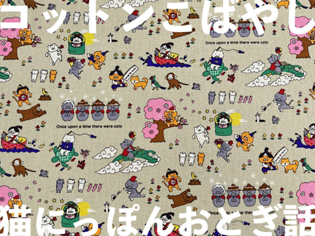 ぬのにちは♪大塚屋ネットショップでございます。桃太郎、金太郎、はなさかじいさん、傘地蔵、そしてかぐや姫。誰もが知っているような日本昔話の数々。その昔話をテーマに、この度あのコットンこばやしさんからユニークな布地が誕生いたしました。この通り、日本の伝統的な昔話の数々と、コットンこばやしさんの伝統的な楽しい猫さんたちが融合し、めちゃんこ楽しい昔話へと昇華されています。よく見ると、猫以外の「犬・猿・キジ」などの動物もいますね!カラーバリエーションは、こちらの4タイプ。シーチングよりも少し厚手の綿麻キャンバス生地です。トートバッグやエプロンなどの生活雑貨制作、クッションなどのインテリアカバーのハンドメ